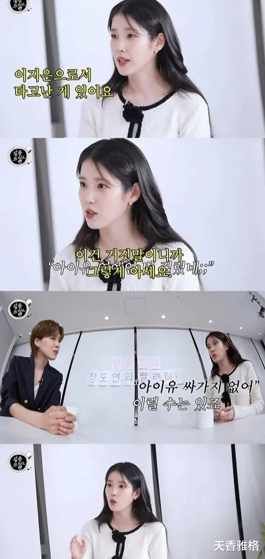 "IU 姐姐真的好直率!直接回答 ' 我本来就没礼貌 ' 的样子好神奇。艺人能这么坦诚地说话真的很少见。不过她提到自我物化这点有点让人担心..."