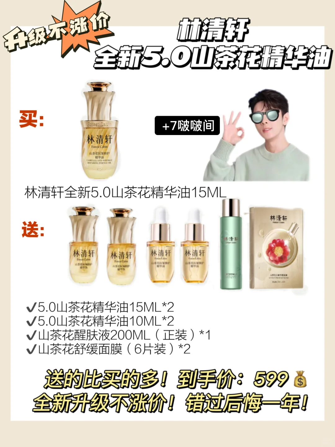 赠送:5.0山茶花精华油15ML*2+5.0山茶花精华油10ML*2+山茶花精粹醒肤液200ML*1+山茶花泛醇舒缓面膜1盒