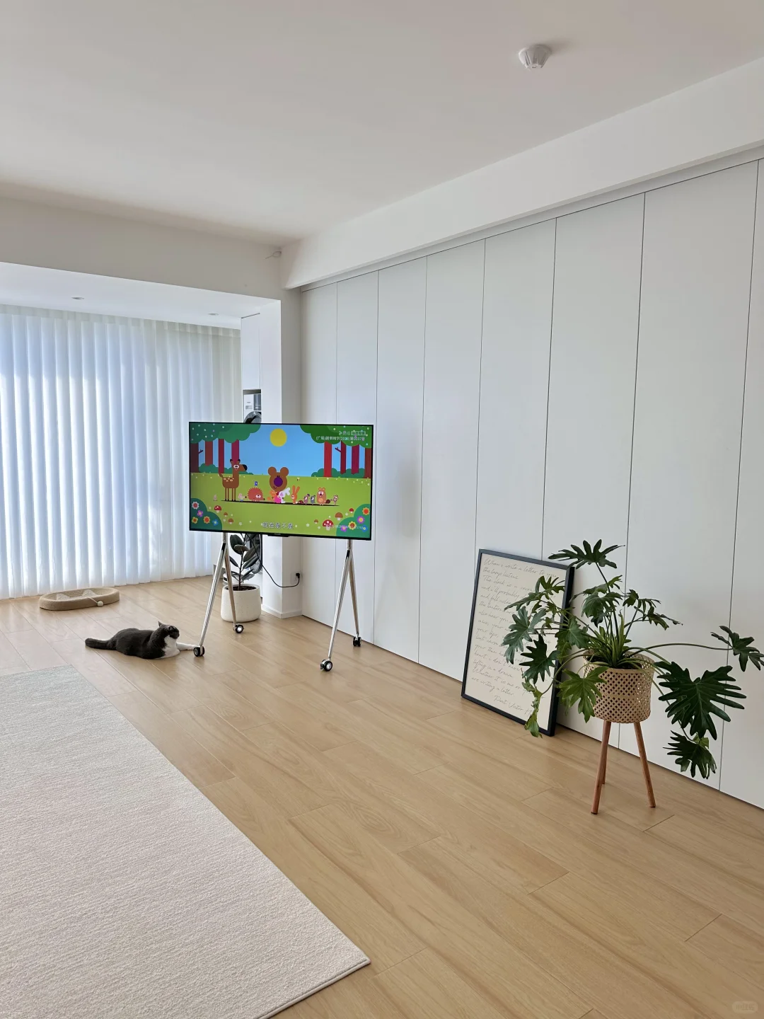 一个支架电视,一块地毯,和一个沙发,加一些软装就组成了整个客厅,虽然简单,但是给我家两个小朋友提供足够宽敞的活动空间。