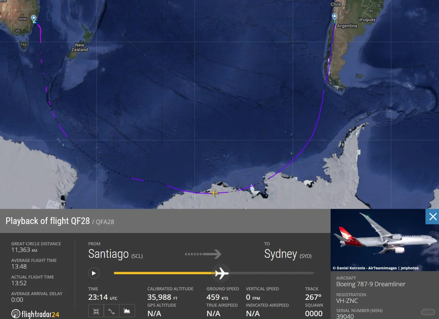 昨天,澳航QF28航班从智利圣地亚哥飞往澳大利亚悉尼,途经南极洲(其实就是切了个边儿)。 一般来说,最短的大圆航线是横穿太平洋,之所以能飞越南极洲,是因为当时有顺风。 一般有顺风的时候,澳航都会选择这么飞,干挺多次了。 澳航 南极洲 图片来自网络