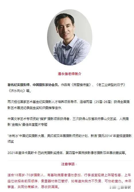 不走寻常路,深入小众点。 我们通过游走、感受,不断地在创作、实践中提升自我,行程中由两位老师全程指导。 摄影工作坊创作班招募时间 2024.11.09 - 11.19 (招8-12人) 11月 9日 兰州酒店集合日(早到早逛,有黄河楼、中山桥) 11月10日 兰州--炳灵峡--炳灵寺--大敦煌影视城--兰州 11月11日 兰州--武威博物馆--文庙--雷台汉墓铜奔马--张掖 11月12日 张掖--马蹄寺--冰沟丹霞--张掖 11月13日 张掖--外星谷--魔山地质公园--嘉峪关 11月14日 嘉峪关城楼--长城第一墩--玉门废城---大地之子--汉武大帝--瓜州 11月15日 瓜州---榆林窟--锁阳城--敦煌 11月16日 敦煌--丝路遗产城--敦煌博物馆---敦煌 11月17日 敦煌--阿克塞-黑独山-石油基地遗址--冷湖 11月18日 冷湖--俄博梁-咽脂山--冷湖 11月19日 冷湖--回敦煌下午解散送车站、机场。 以上行程根据天气、路况、偏好需适当调整,望知晓。 11·09日兰州酒店集合晚上 有欢迎晚宴。 11·09~11.19日下午敦煌解散。7600元/人(11天) 以上包含﹕创作过程中的用车(商务车)、住宿(11晚、准四星、豪华商务酒店)+含早,以及老师的指导费,每人100万的意外险。(报名时留下姓名、手机号、身份证号,以便统一购买意外险)。 以上不含﹕全国各地往返兰州/敦煌的大交通,不含景点门票(携带60岁身份证、军人证、各级摄影家会员证有减免)、不含税、不含中晚餐AA有推荐和个人消费。 报名费订金2600元/人,余额酒店报到时结清。(单房差另计) 10.26日前报名早鸟票、2人同时报名,各免500元/人。 报到前提交5幅、结束后各交10幅作品以便交流、点评、并推荐专业媒体发表、大赛,发邮箱302859334@qq·com,结束前有幻灯片投影交流辅导。 #中国水下摄影# #秋游敦煌# #甘肃的敦煌# #探寻甘肃之美# #敦煌实拍# #大西北甘肃敦煌# #祁连丹霞嘉峪关#