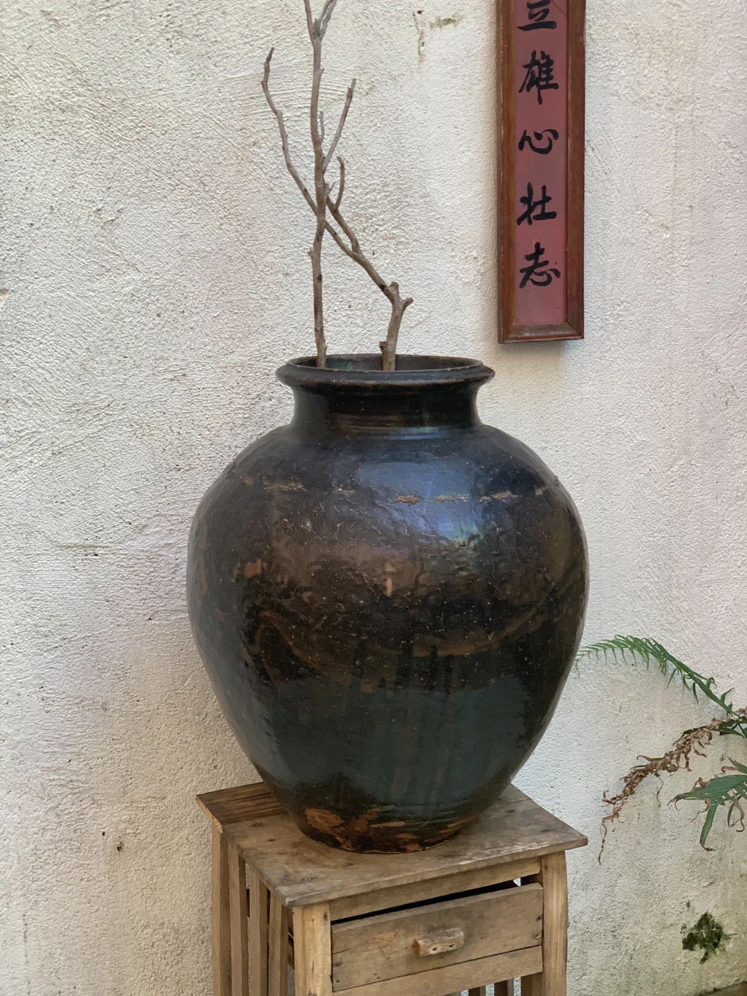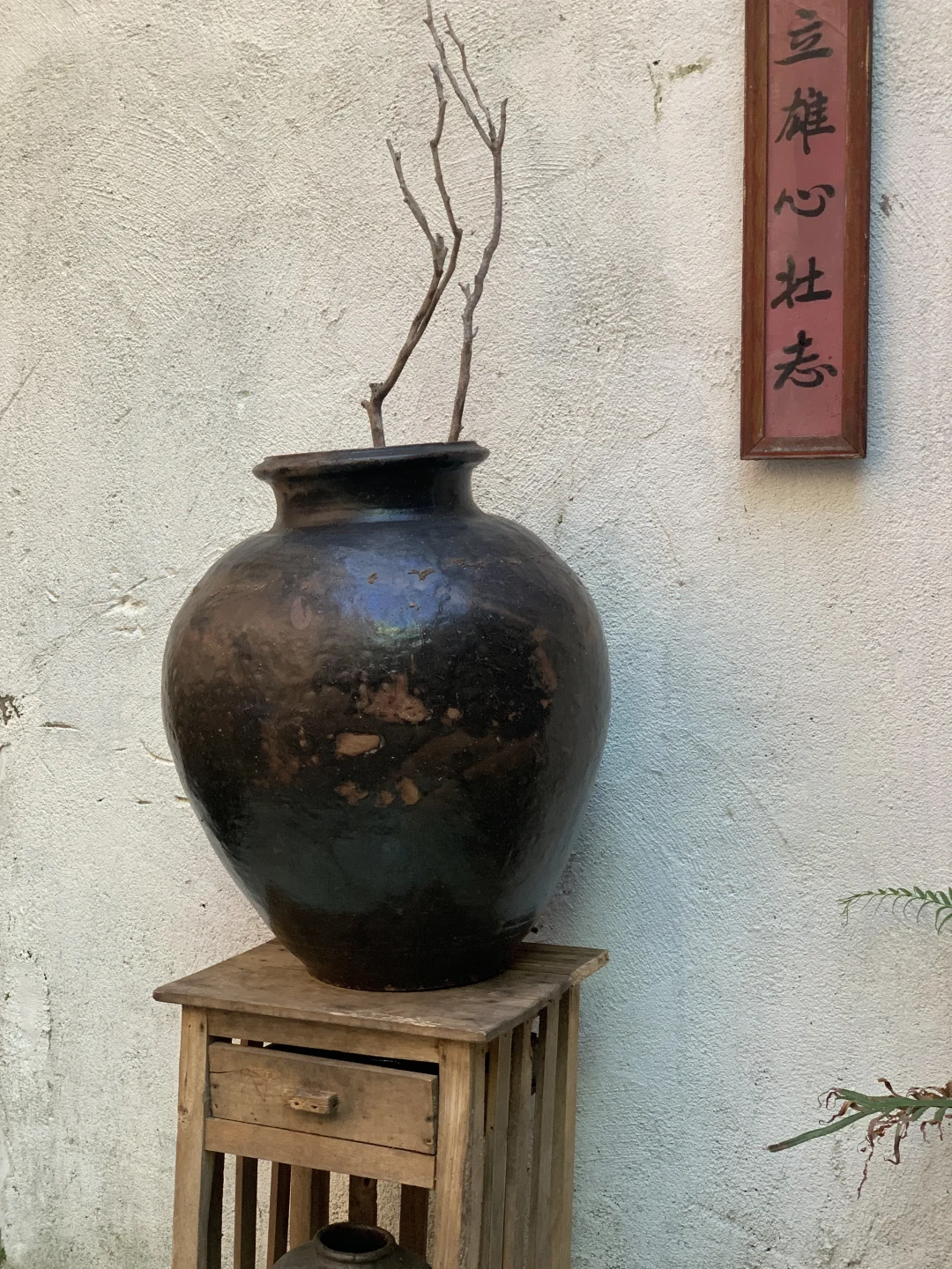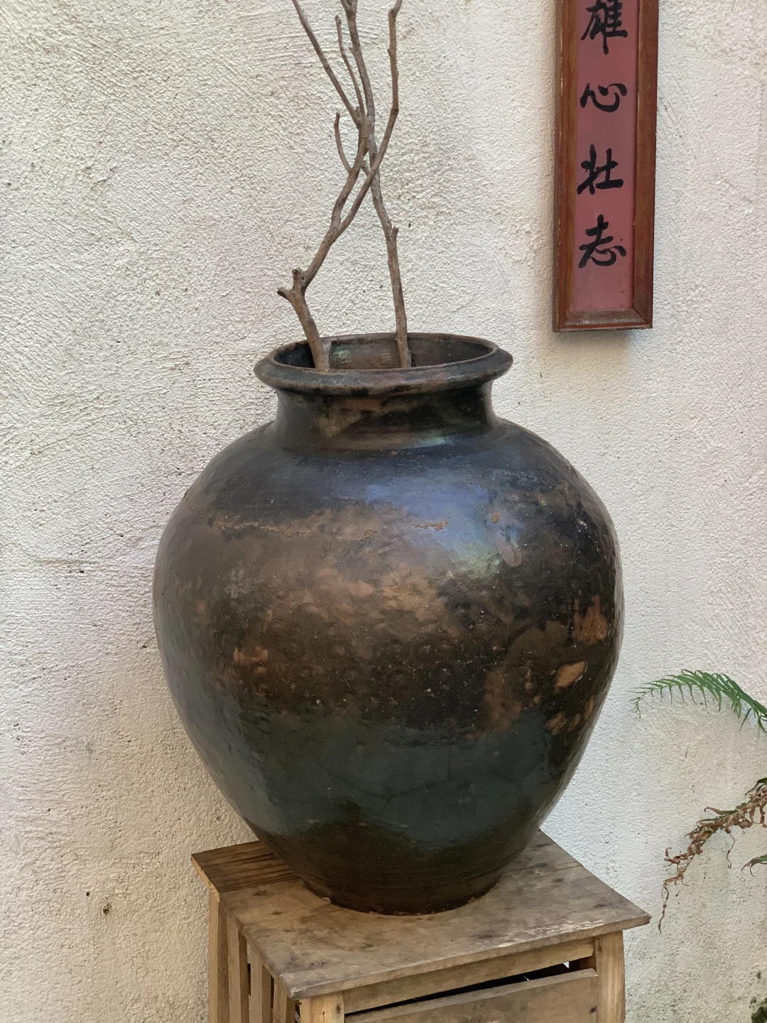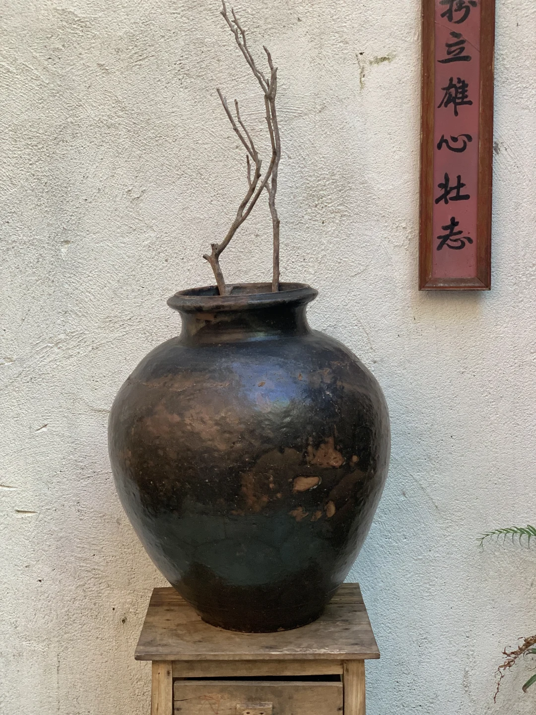 钱纹大口径高罐,包浆油润;花艺插花;民宿茶室极简侘寂摆件;适合庭院大型绿栽;43*43*56厘米高,口径20厘米宽。