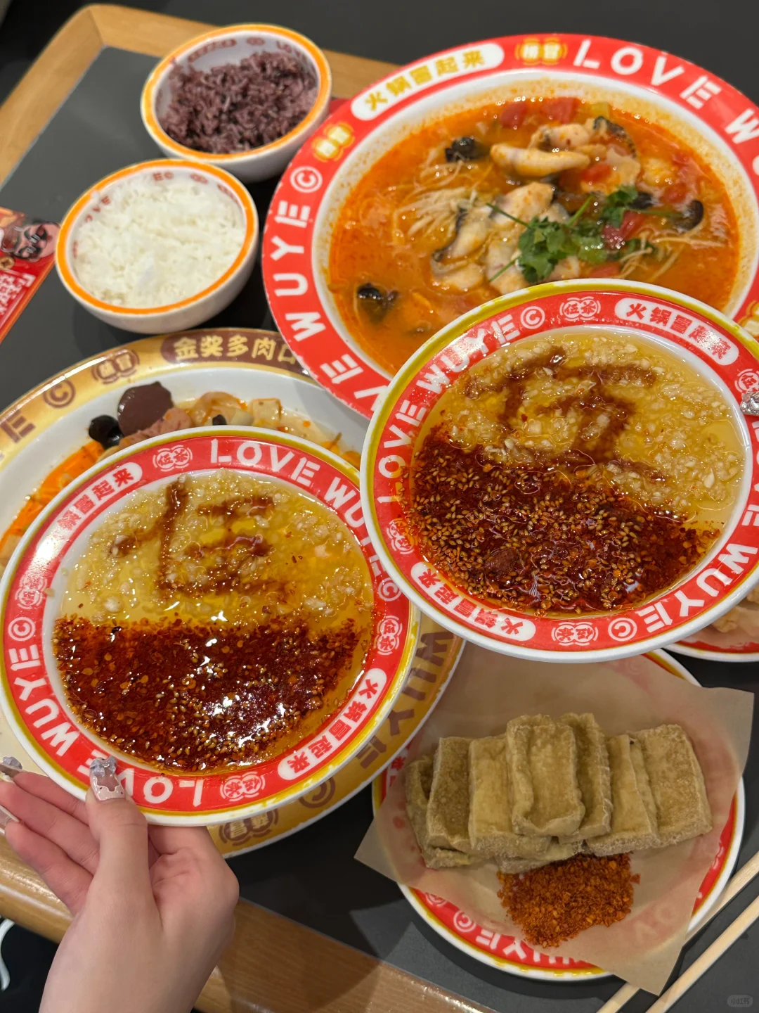 还有现焖的五常米饭和杂粮饭,米饭都是小电饭煲现焖的,新鲜又香软,配着冒菜简直绝了!