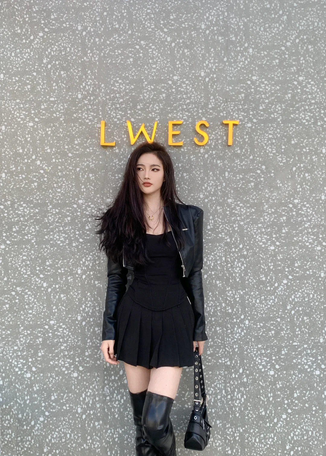 今天穿了一身全黑All black 跟朋友出去玩儿,不得不说小皮衣看似短,却很保暖,搭配方头过膝长靴,一点都不冷,走几步路还会觉得热[自拍R]