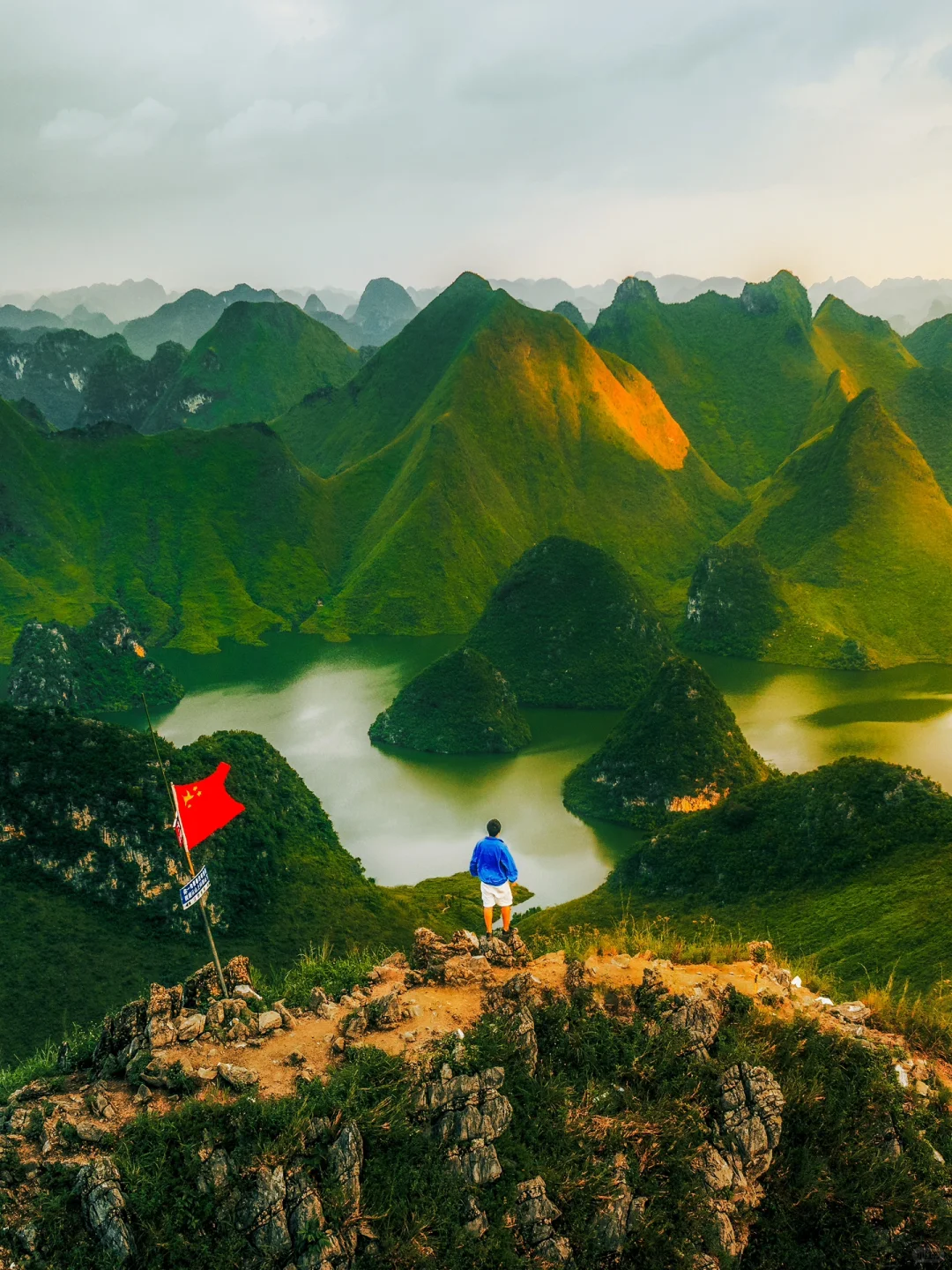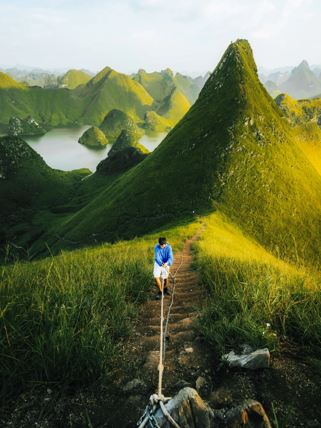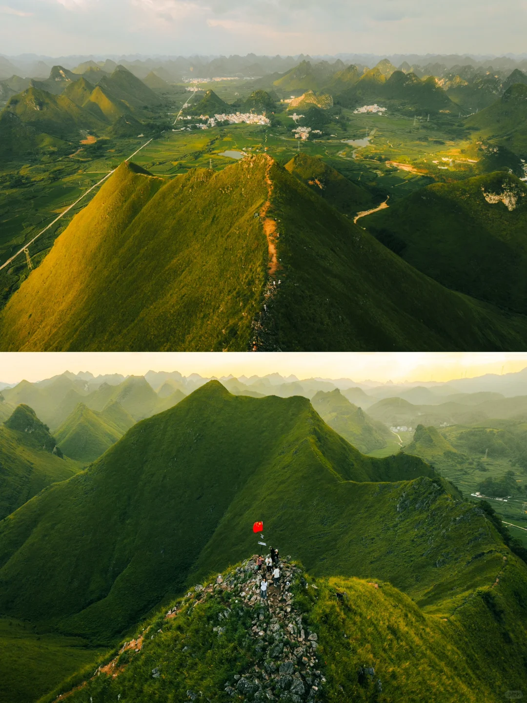 ⛰️剑龙山最近很火,因为地貌独特,这些山峰峥嵘耸立,形态各异,像利剑出鞘一般,加上这里是水库,风景很美!爬山虽然很累,但是站上山顶的那一刻,你会发现一切都是值得的! - ✅路线选择 ♻️大环线 有多个登山口,时间充裕的游客可以走大环线,不走回头路,耗时约4个多小时 💦水库 水库走上去约1个多小时,走到分岔路,1.向左边爬上去是距离水库最近的山头。2.向右边爬上去可以和大环线路段连接起来,是一个又一个小山头经山脊连接,山顶有旗和路牌,人可以在山脊上走,两侧风景不同,一侧水库山景,一侧田园山景。我走的是这条路线,拍完照原路下山返回 - ⛰️景点:剑龙山 📍地点:广西壮族自治区崇左市天等县(直接搜剑龙山停车场导航过去) 🚗交通:自驾,附近没有公共交通 🏨住宿:天等县城距离景点约40分钟车程 - ⚠️TIPS 1.要穿防滑鞋,带登山杖,上山容易下山难,脚下容易打滑 2.穿长裤!防晒衣!可以带遮阳帽,山顶没有躲太阳的地方,还是挺晒的 3.爬山过程中也会用到手,可以带手套防脏防磨 4.水的话可以多带几瓶 5.一定要带雨伞,这次去拍着拍着突然下了大雨,直接淋了一个多小时的雨才下山