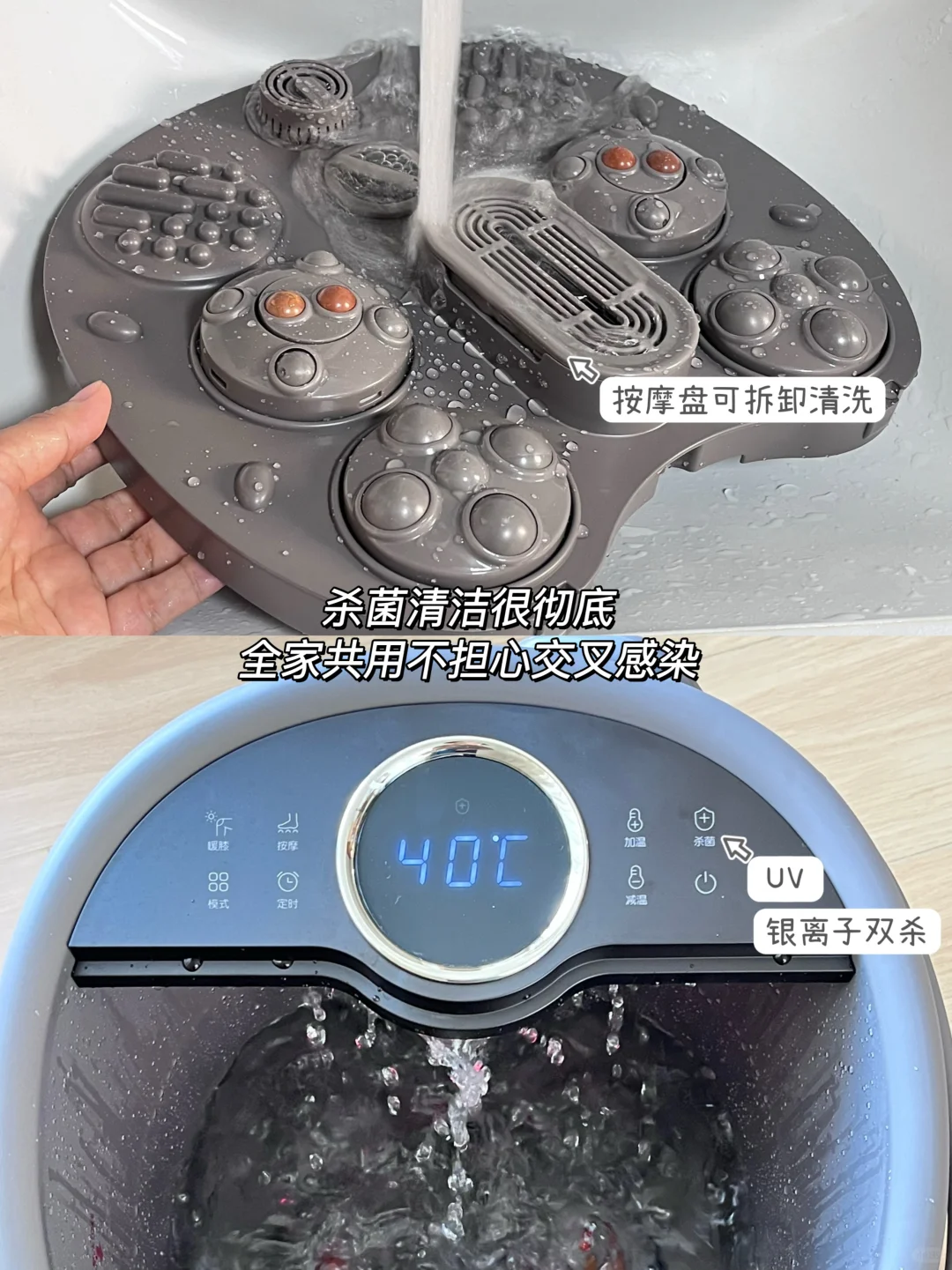 ❌以前用的传统泡脚桶,因为难清洗,用久了总是有异味,而且还不能跟家人共用,生怕交叉感染!现在这款小熊泡脚桶就很牛了!自带全链路UV+银离子双重杀菌!干净又卫生!按摩盘还可以拆卸清洗,完全没有卫生死角,全家都能一起用!