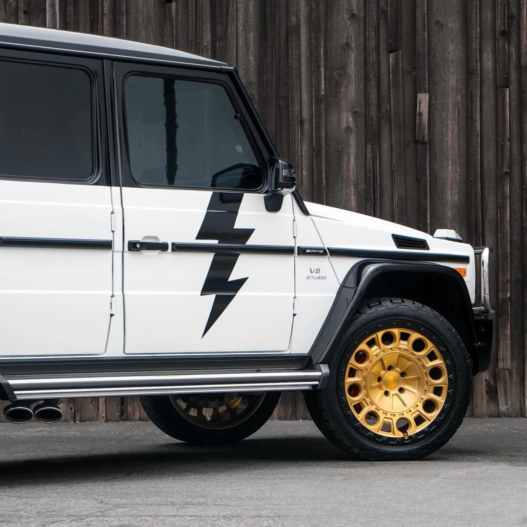 为什么别人的大G改得那么酷 你自己改的大G这么丑? 今天的款式是Formula 的Aventerra系列【黄铜金色】 外圈带有亮黑色的修饰 22寸 装在老款G或者新款G车上也是超帅 另外贴了黑白的双拼色 ♠️⚪️ 前杠 轮眉 后杠 备胎圈都作了黑化 银色的防撞杠 点睛之笔在于【黑色闪电】⚡️ 咱就说 一家高审美还能给出搭配建议又懂技术的店家重不重要?