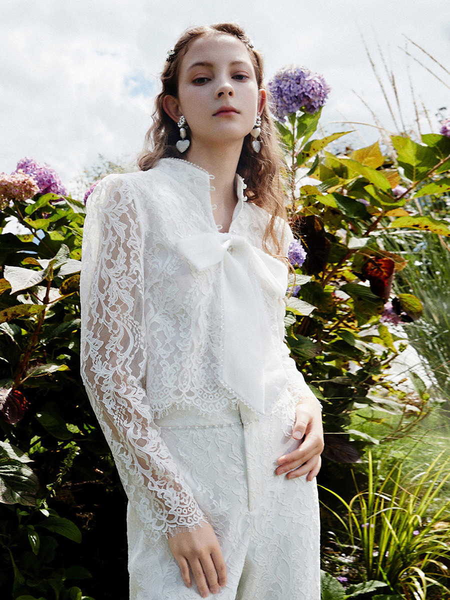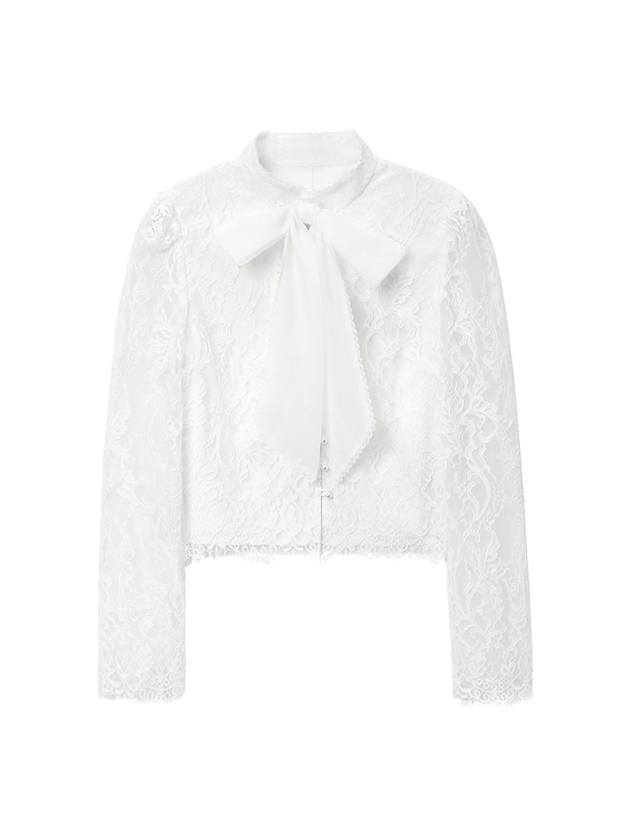 短款设计尽显腰身比例,蝴蝶结绑带设计时尚飘逸,精致优雅有女人味;珍珠扣显简约大方细节质感;睫毛蕾丝,毛絮绣缀于蕾丝上灵动夺目,美感与吸引力强蕾丝轻薄飘逸;