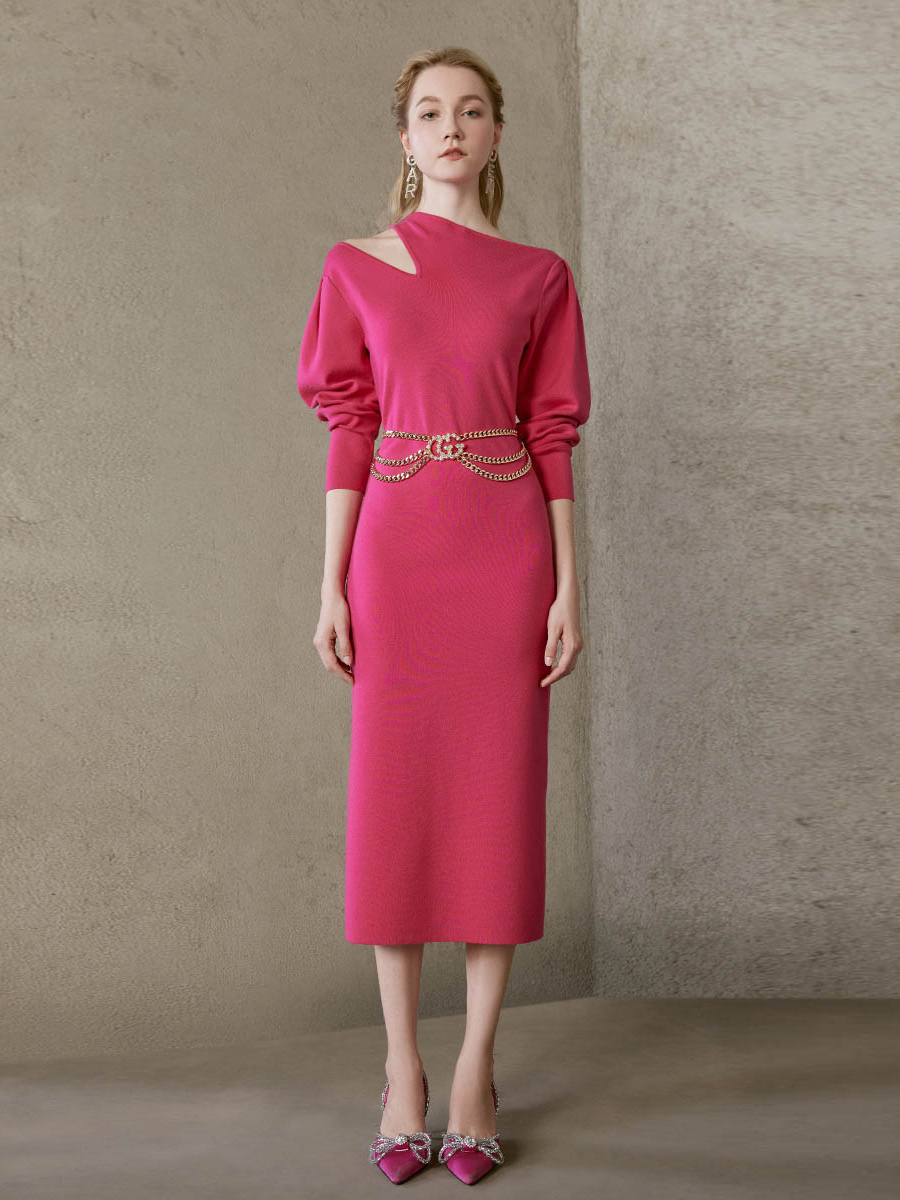 哥文花园秋季新款修身镂空羊毛针织连衣裙