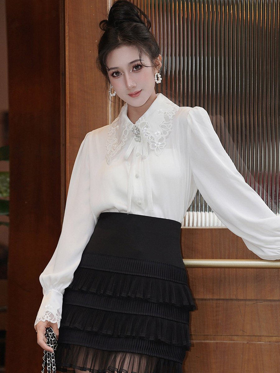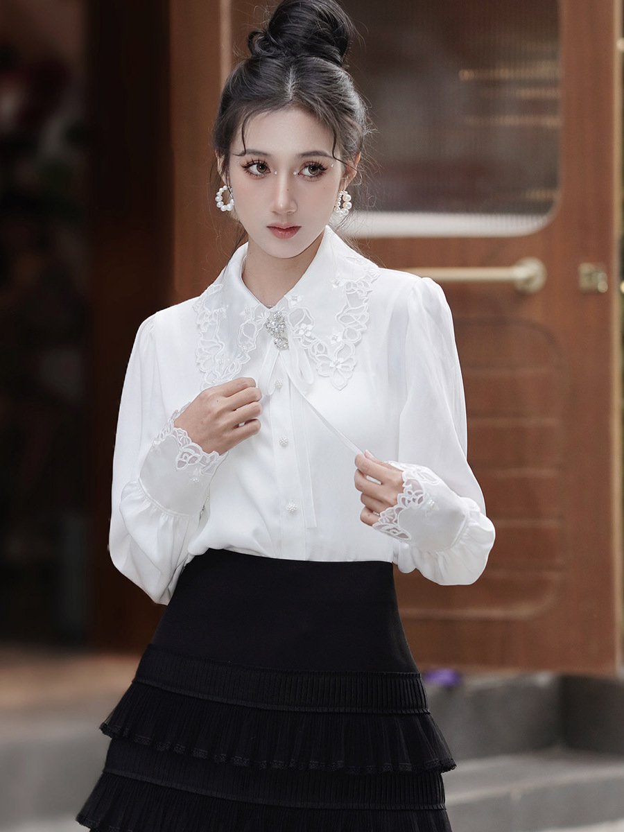 哥文花园秋季新款欧根纱刺绣缎面雪纺白衬衫