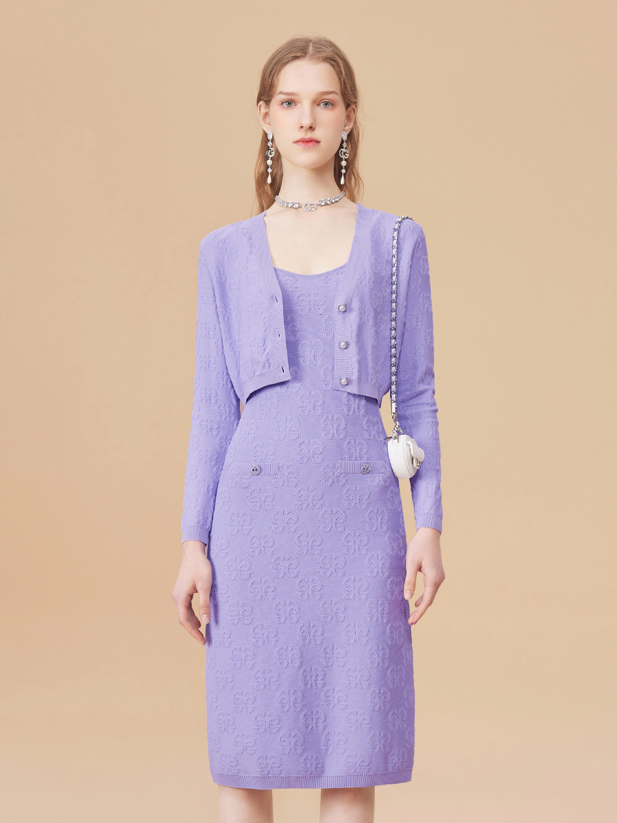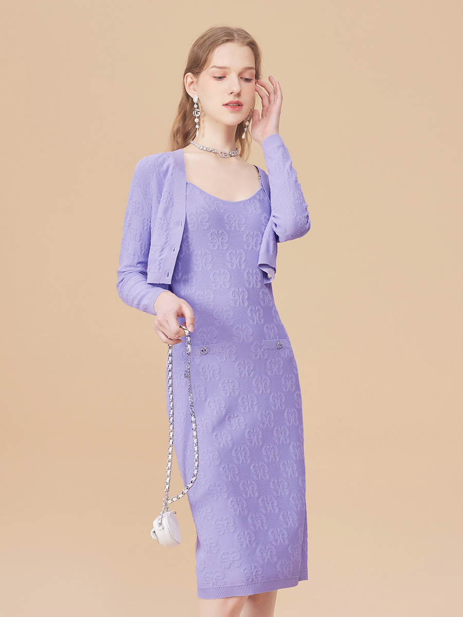 H版型包容性好修身显瘦端庄优雅;吊带CG钻珠扣设计精致优雅;裙身满幅CG标识简约显个性;粘胶针织混纺面料,表面针织纹理细腻,手感柔软舒适,弹力贴身。