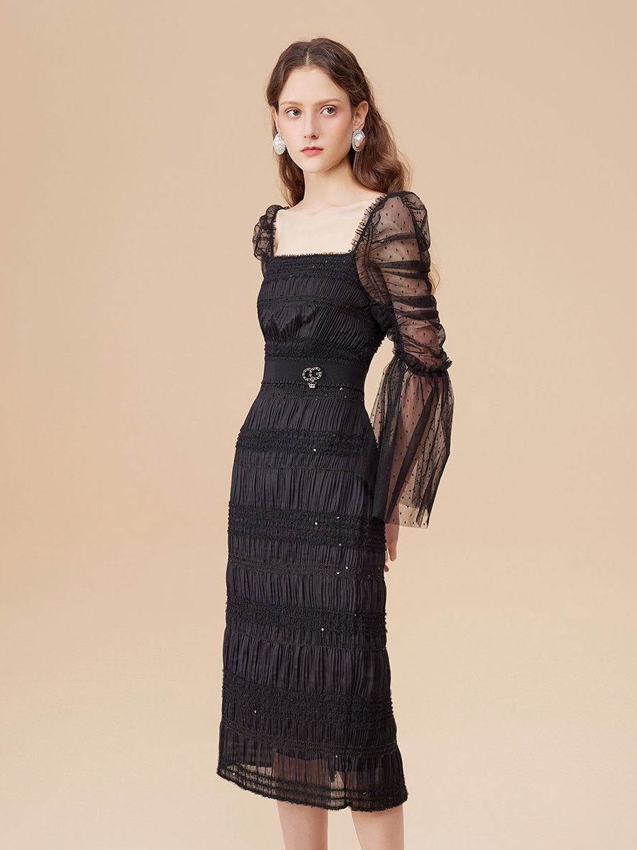 复古方领优雅显瘦,轻松显出迷人锁骨和肩颈线;雪纺打褶珠片绣,以珠片绣缀于褶皱上闪耀错落灵动,增添美感与吸引力,网纱轻薄飘逸;贴合身形的褶皱设计,打造修身效果,勾勒优美身姿;网纱喇叭袖突显出轻盈浪漫氛围感。