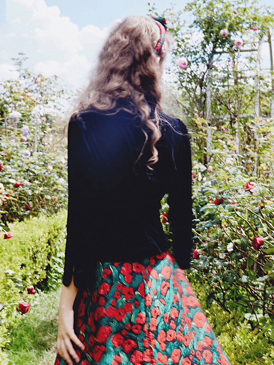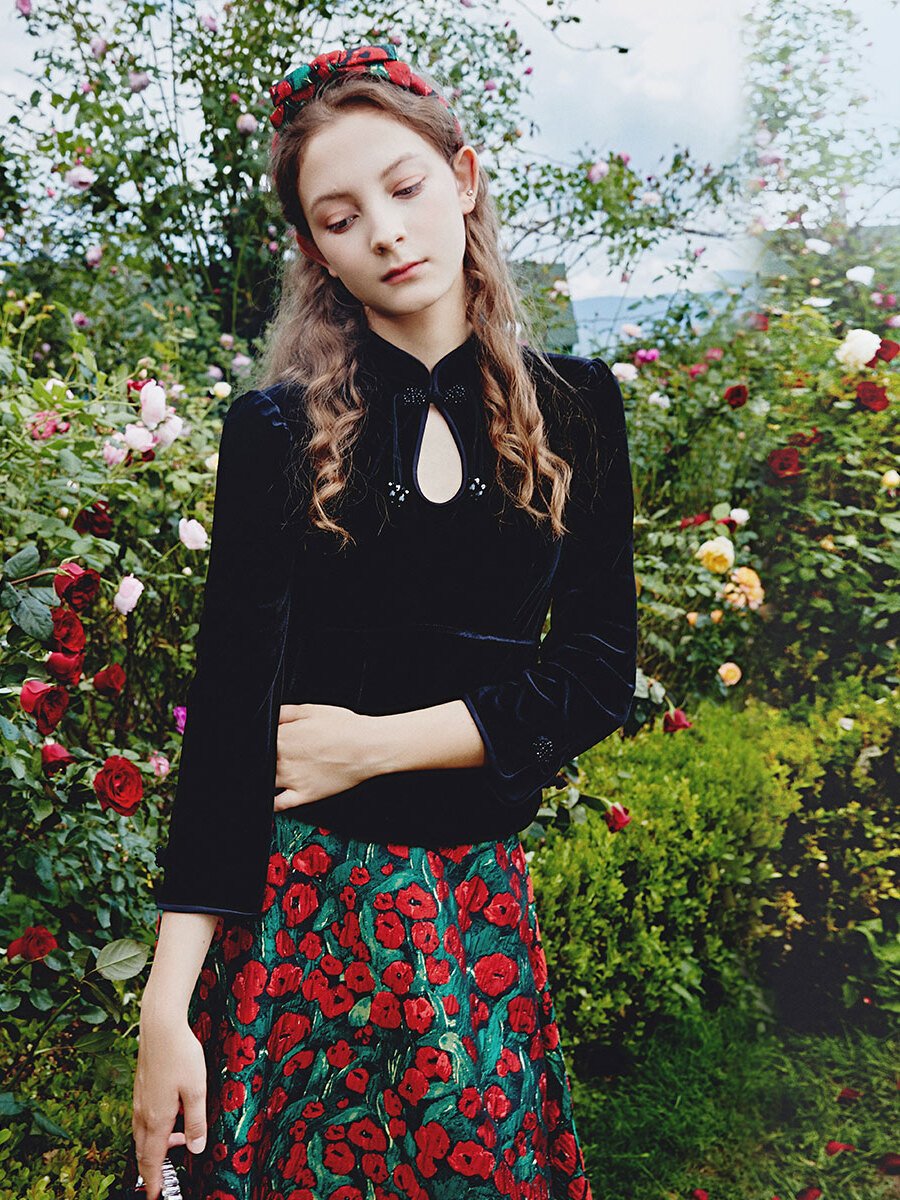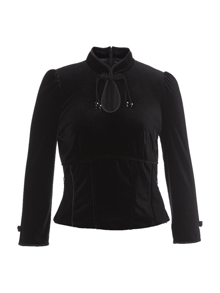 哥文花园秋季国风旗袍镂空领丝绒衬衫上衣