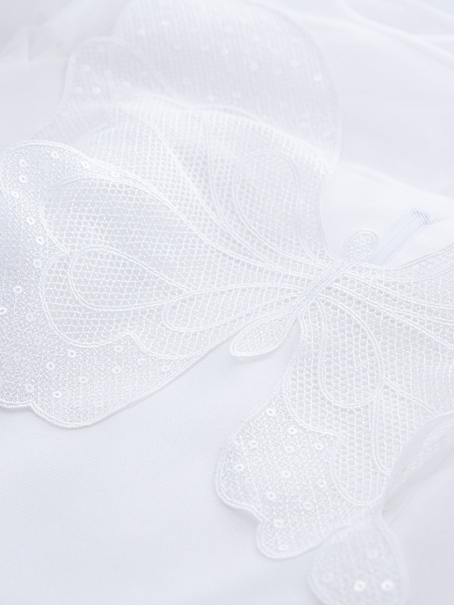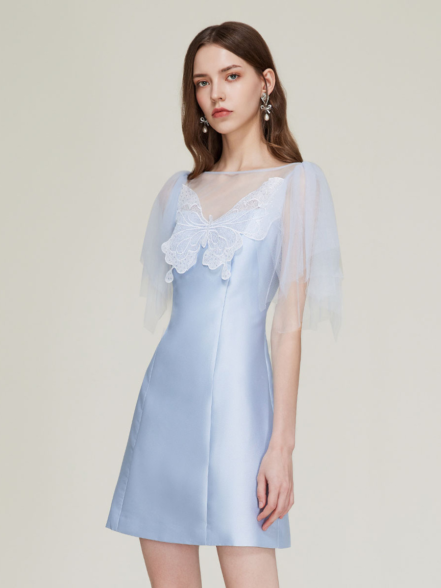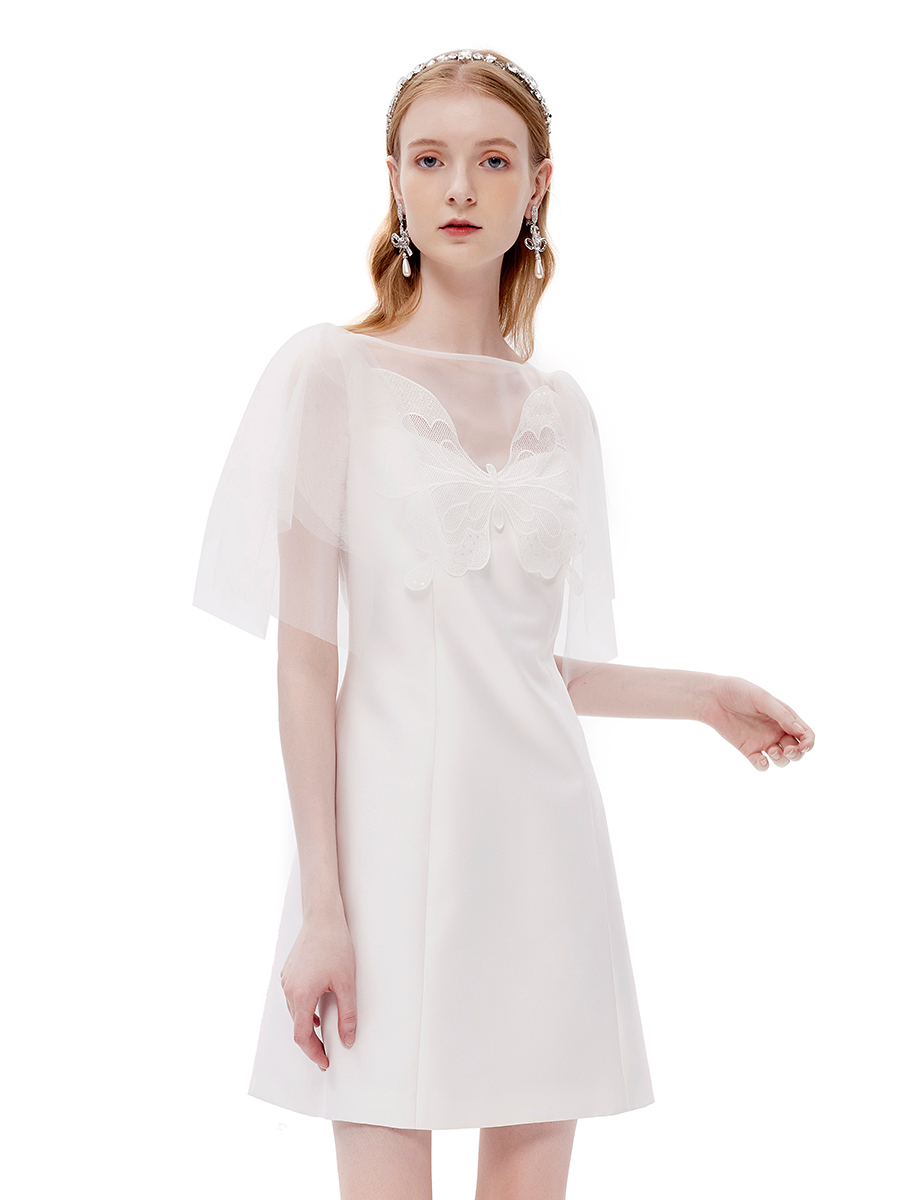 面料挺括有型,穿着舒适柔软,彰显品质;CG经典小礼服,打造端庄优雅气质;网纱蝴蝶刺绣呈现仙女般浪漫,俏皮可爱;网纱飞飞袖修饰手臂线条,呈现朦胧美感;丝涤双面细斜,具有较高的强度与弹性恢复能力有抗皱免烫的特色,光泽感颇佳。