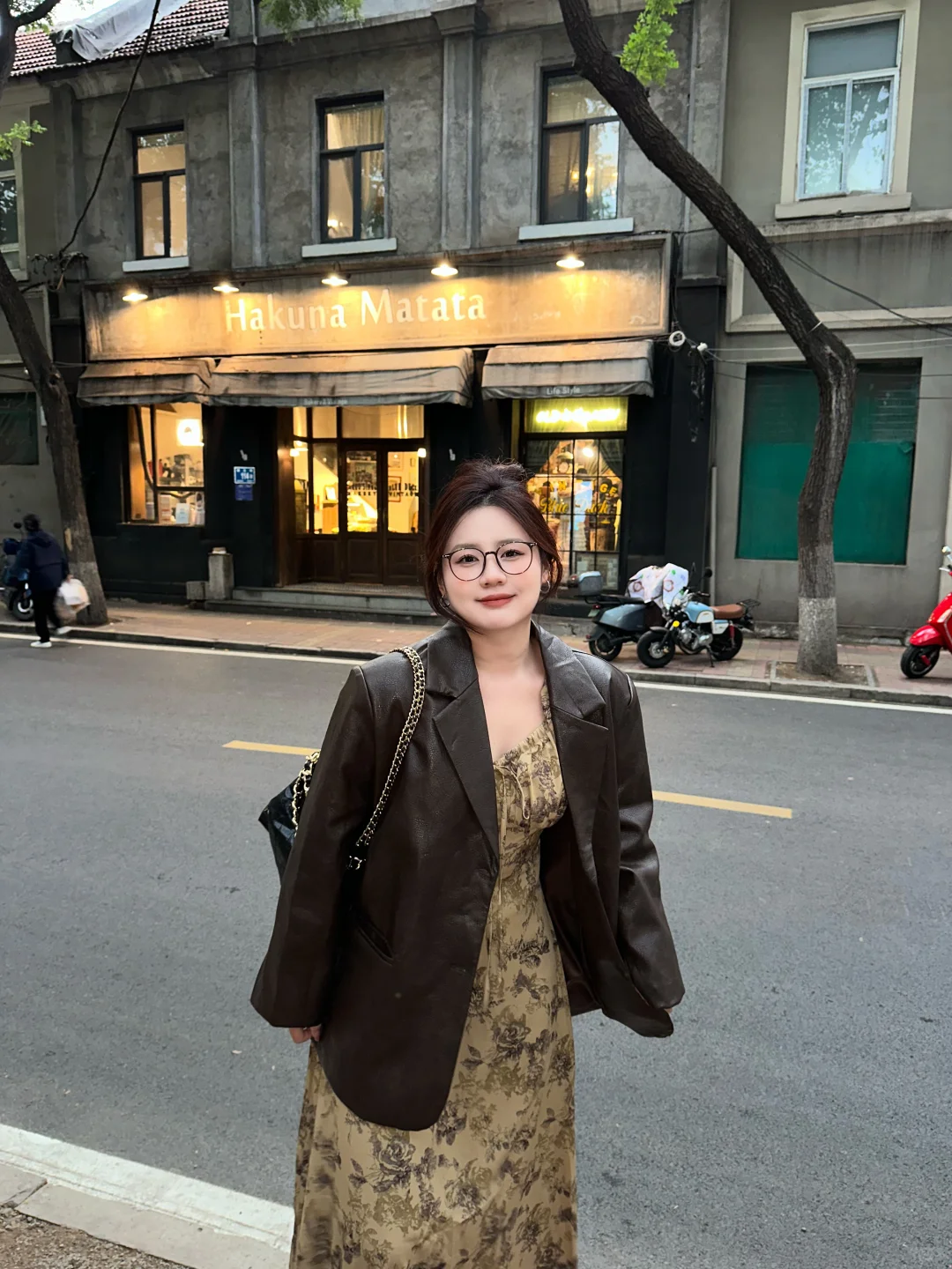 大大的皮衣搭碎花裙有点好看! 蛮适合梨形身材的姐妹 好显瘦~ 拿捏秋冬氛围感 又酷又温柔的感觉 喜欢这个裙子的长度~
