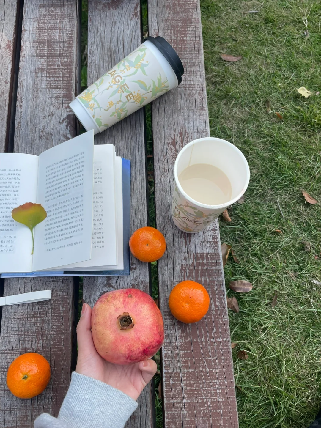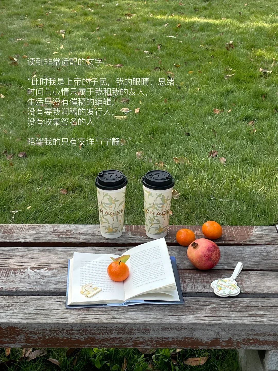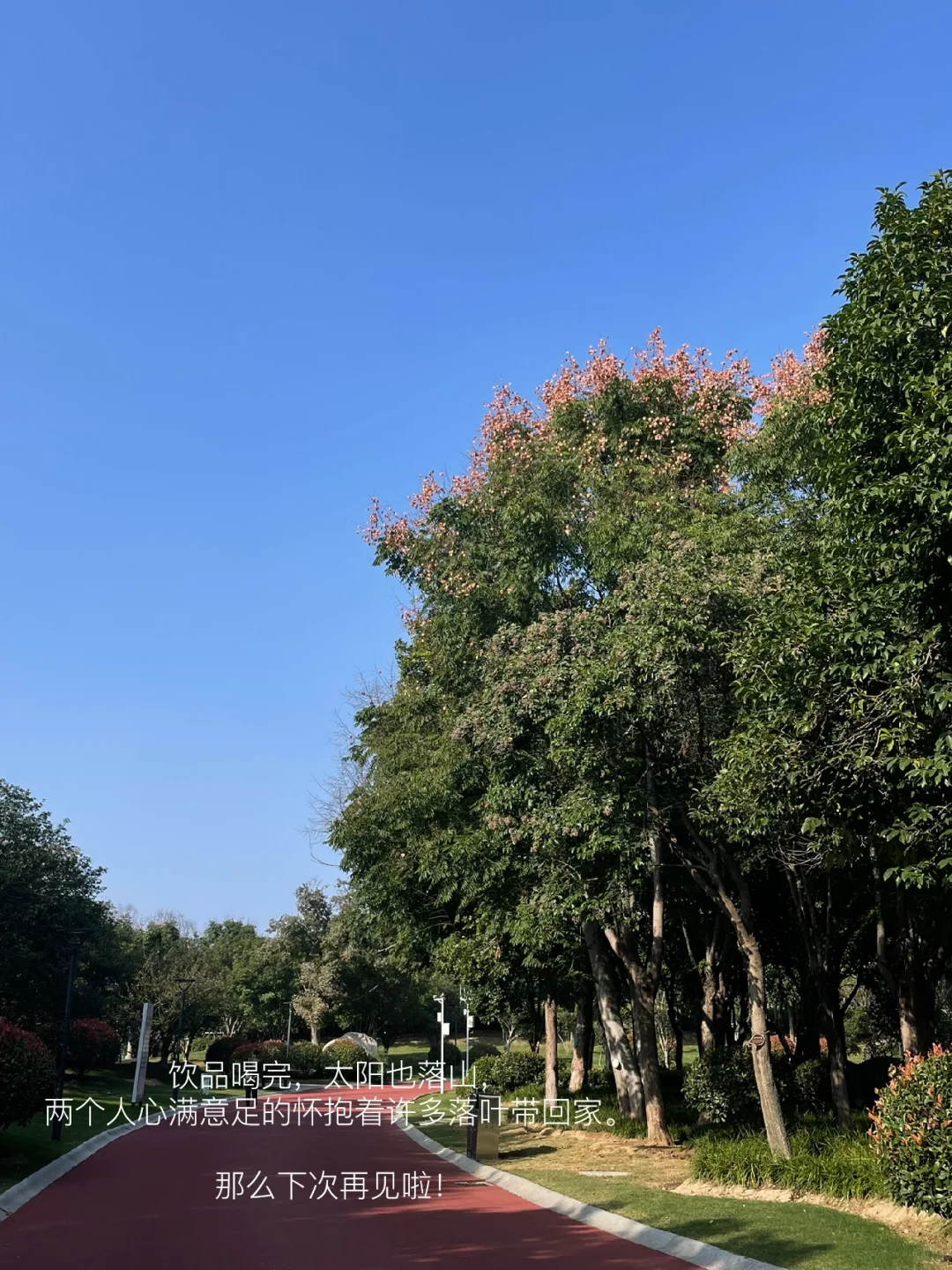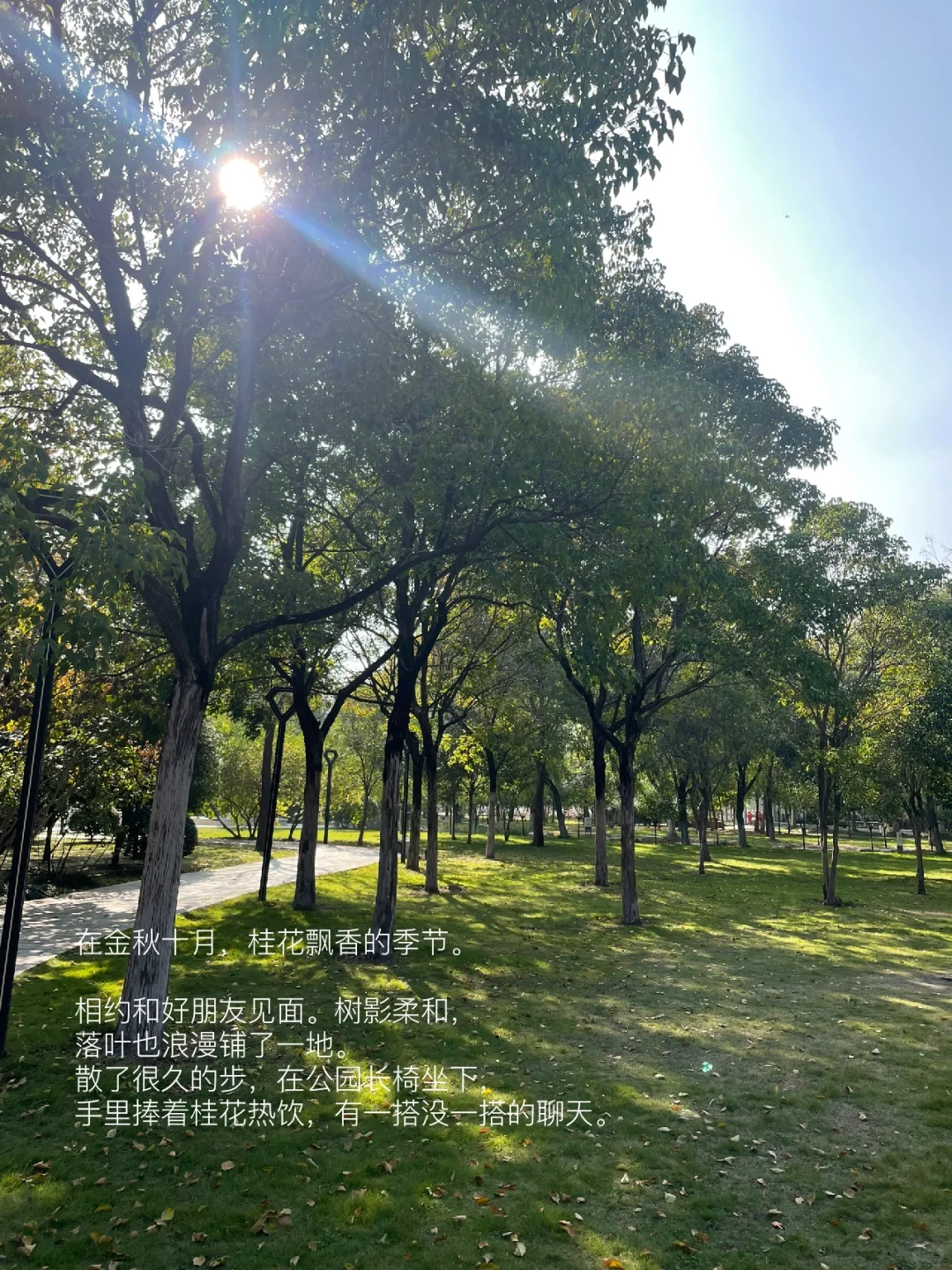 相约和好朋友见面。树影柔和,落叶也浪漫铺了一地。散了很久的步,在公园长椅坐下,手里捧着桂花热饮,有一搭没一搭的聊天。