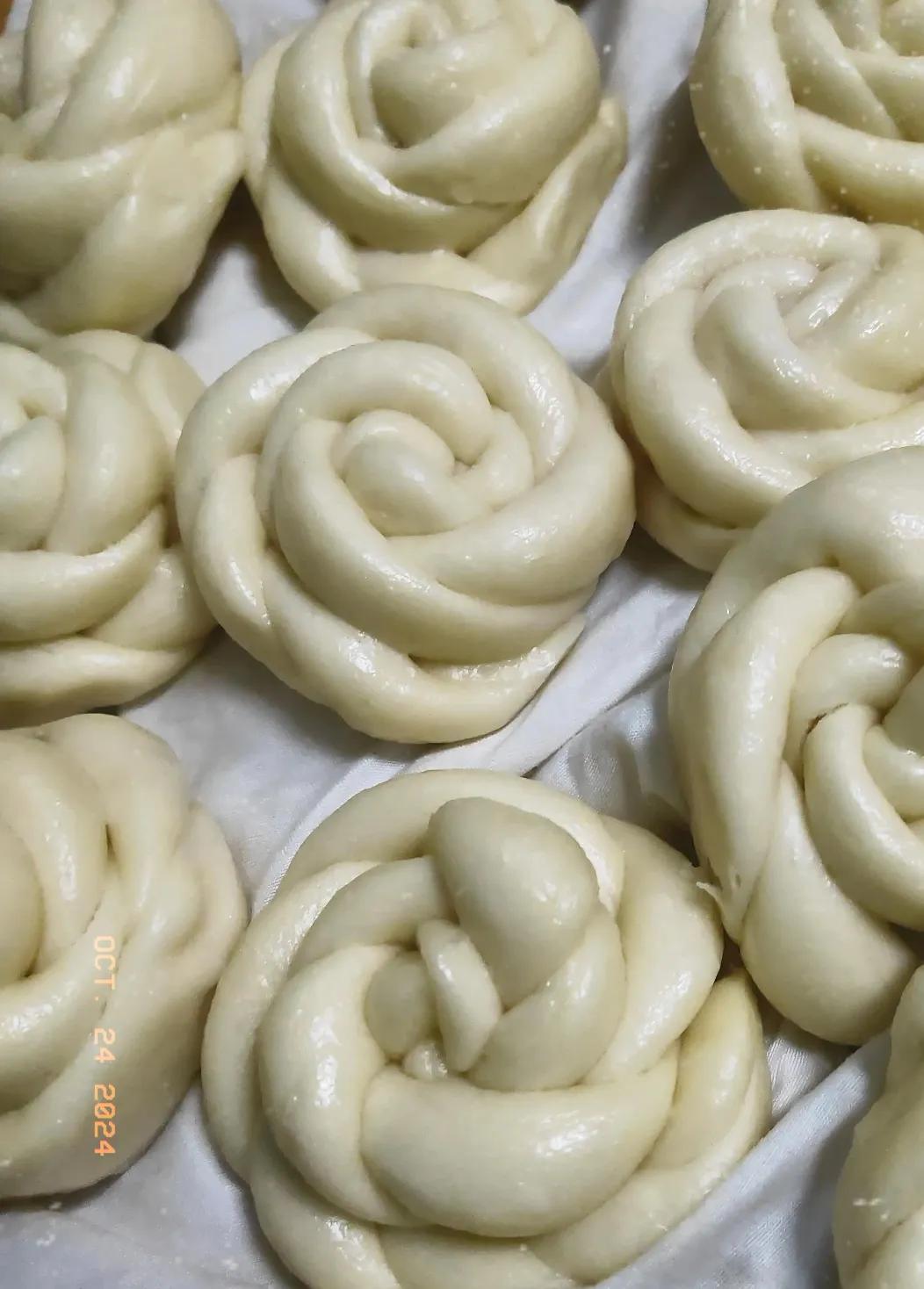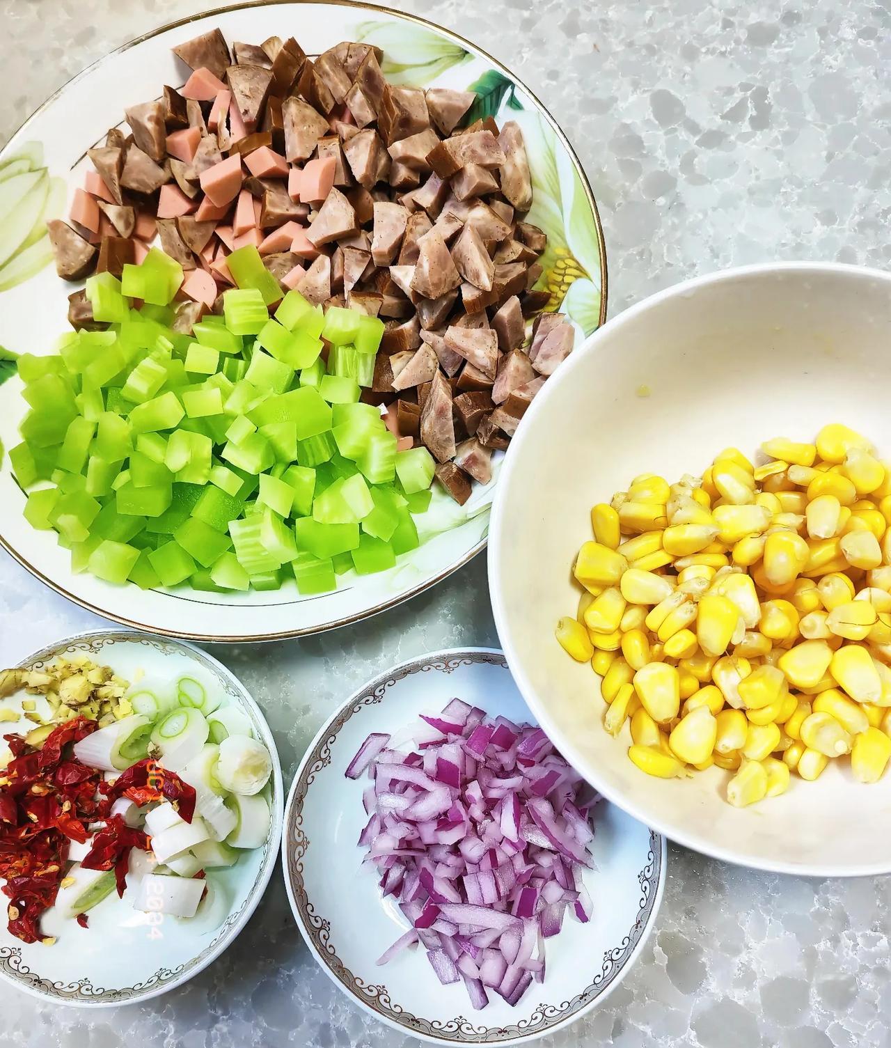 #秋日三餐打卡#今日,6点半起床,天灰蒙蒙的,似要下雨。早餐2菜一饭一馍:红薯玉米珍子稀饭;香肠、洋葱、青笋小丁丁炒甜玉米粒粒;凉拌黄瓜片;玫瑰花馍,自己昨天蒸的……
