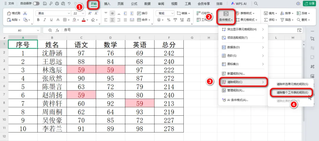 3. 点击下拉菜单中的「清除规则」,选择二级菜单中的「清除整个工作表的规则」。