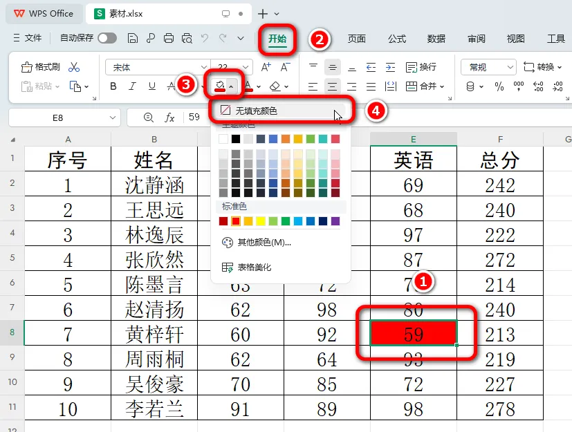 2. 点击「开始」选项卡,在功能区中找到「填充颜色」按钮,点击右侧的小箭头;