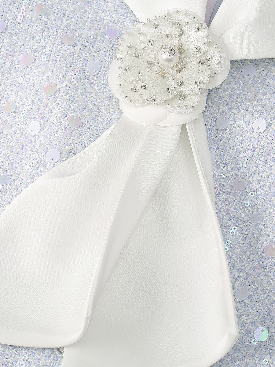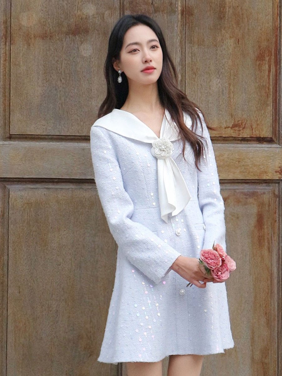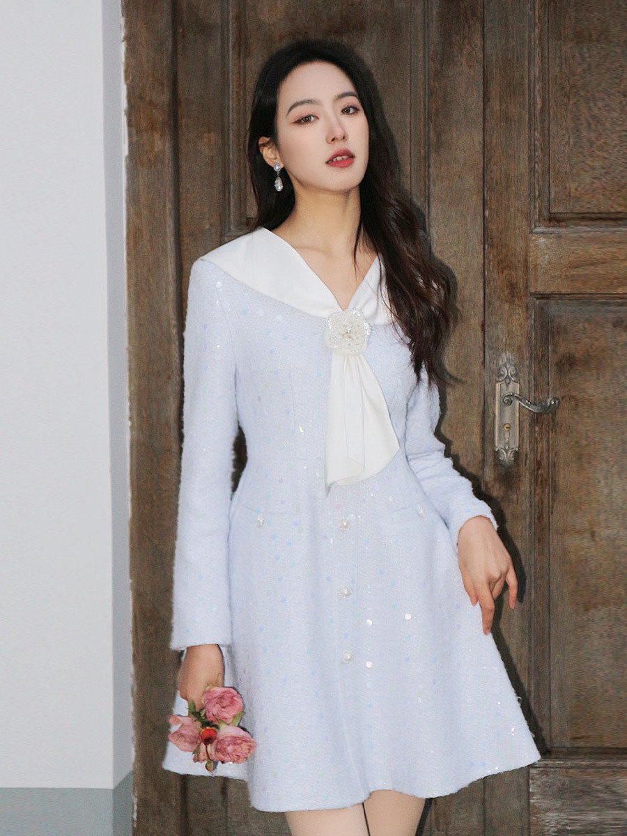 丝巾领设计优雅复古,加入经典的蔷薇花元素,融入品牌DNA,精致浪漫;锦纶面料,柔软抗皱的品质较好,亮丽有光泽,手感柔软舒适;极光紫小香风连衣裙,闪烁幻彩光泽感,精致浪漫;亮片点缀,增添精致度。