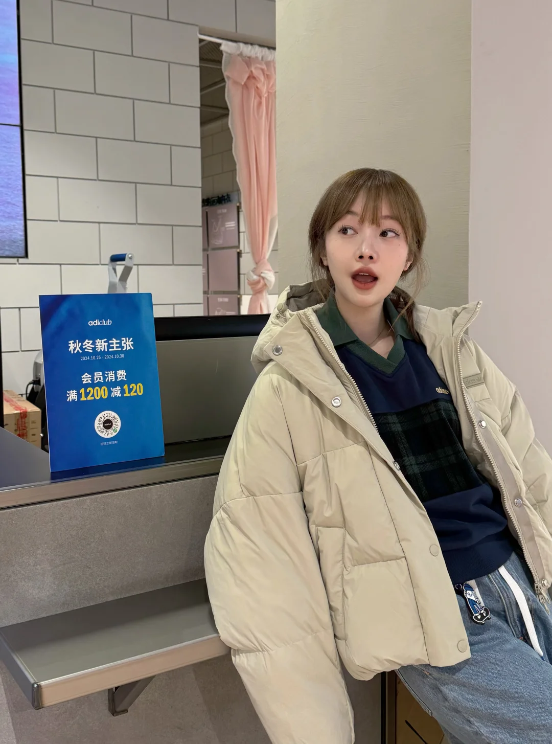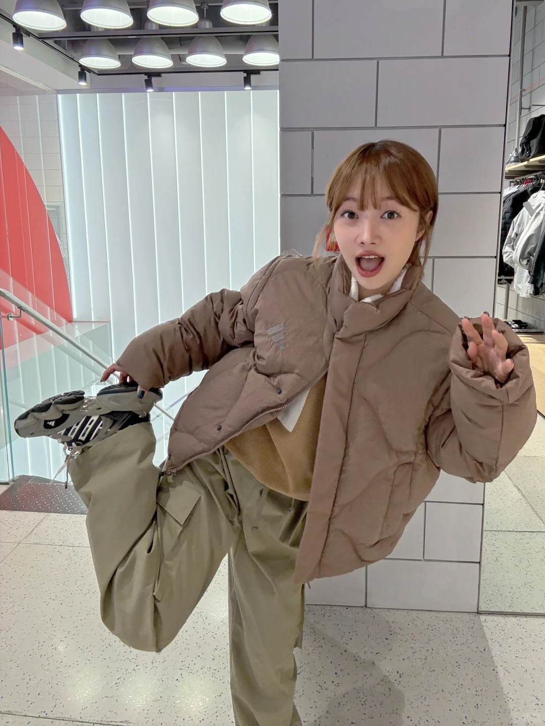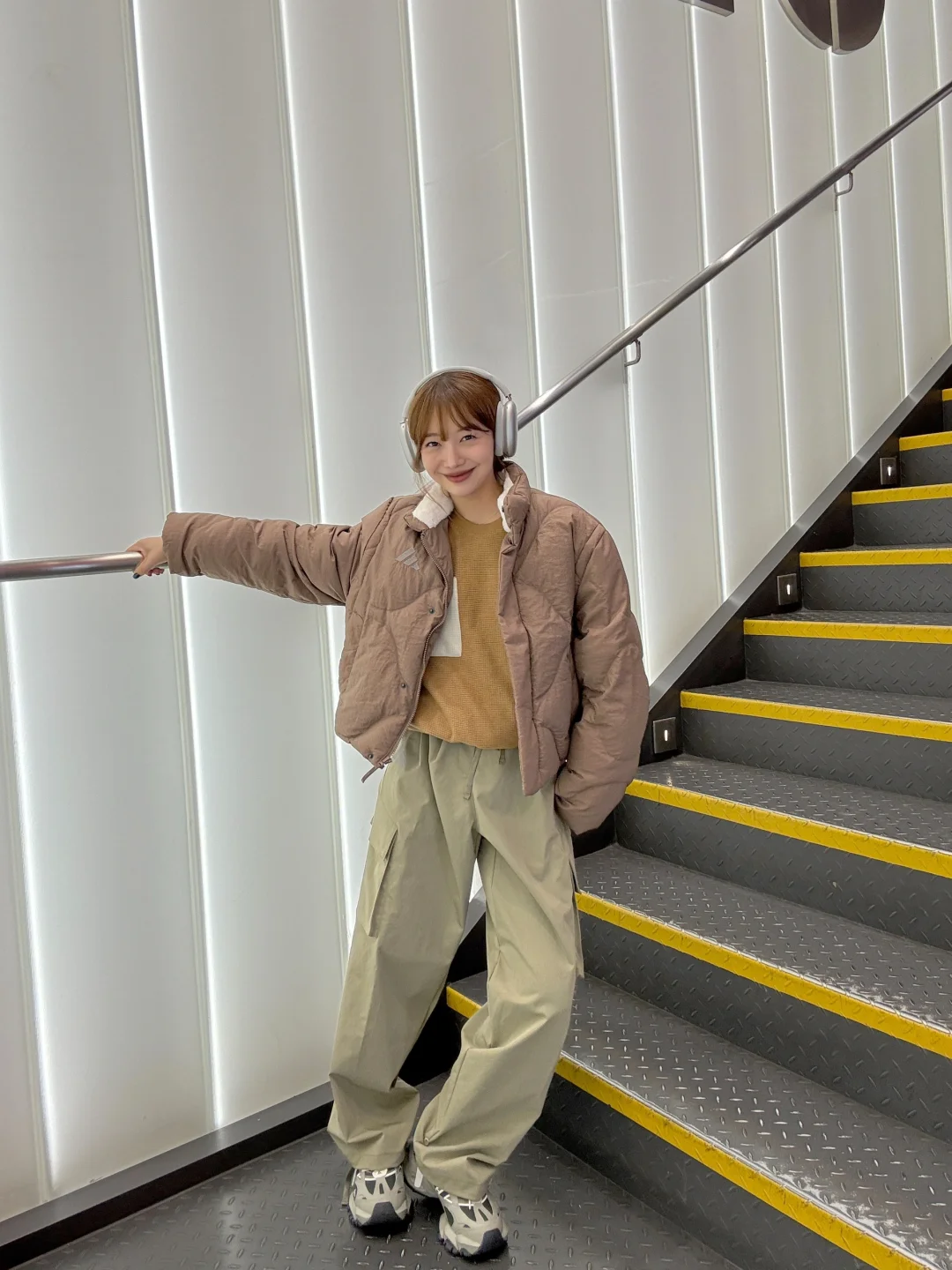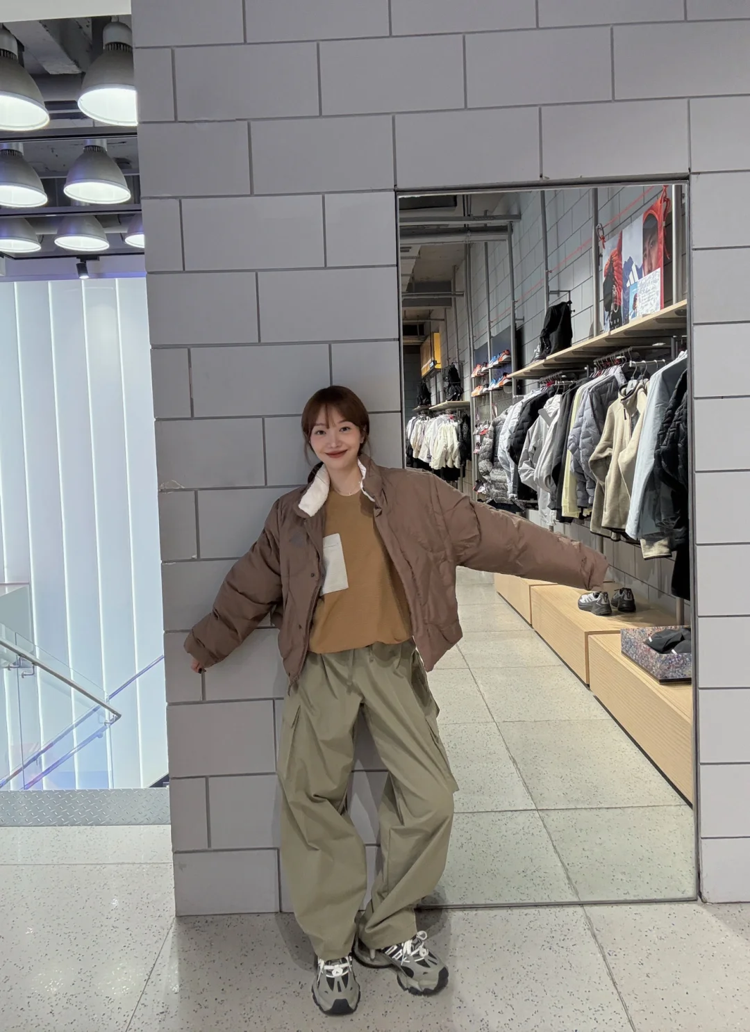 韩系巧棕色羽绒服搭配了一身低饱和的休闲裤及贴肤摇粒绒上衣,