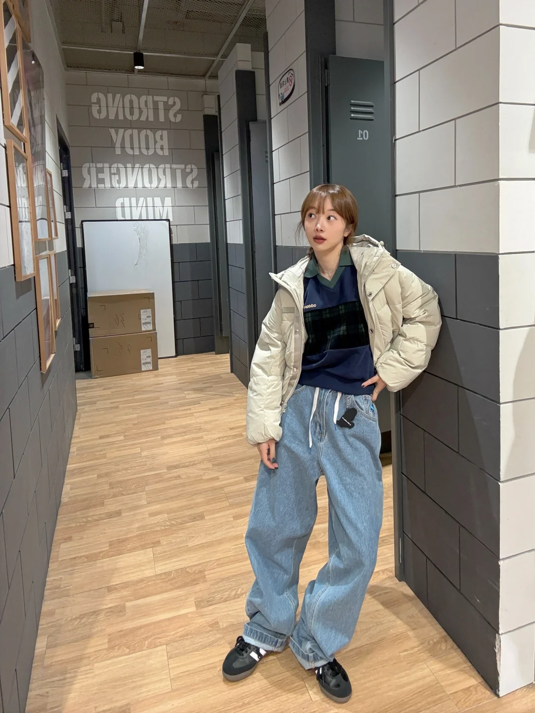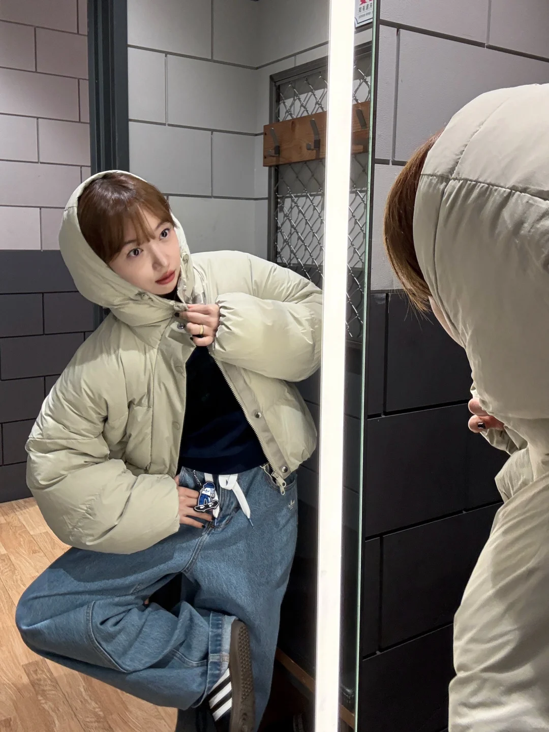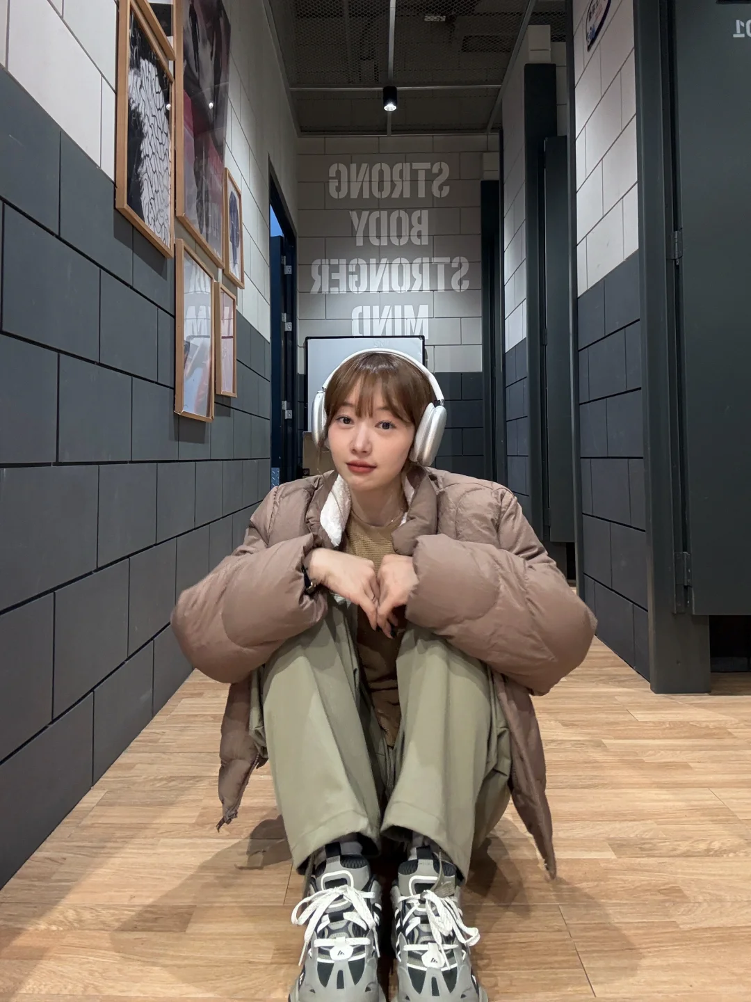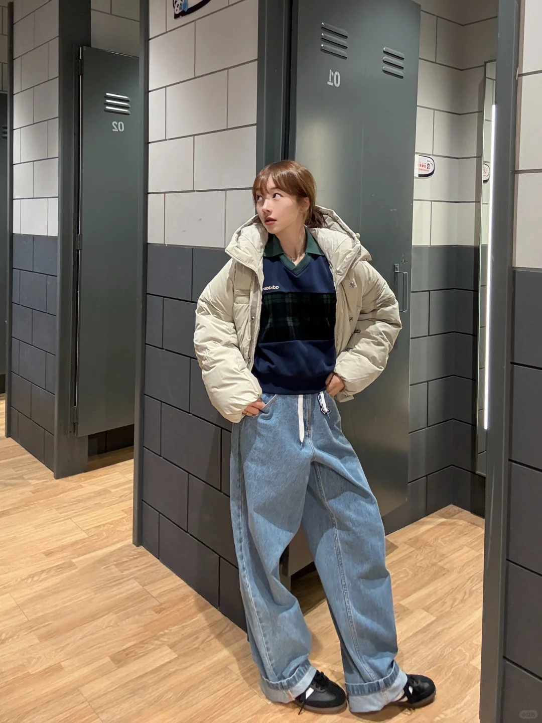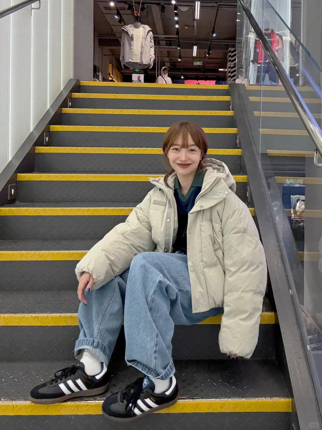 韩系巧棕色羽绒服搭配了一身低饱和的休闲裤及贴肤摇粒绒上衣,