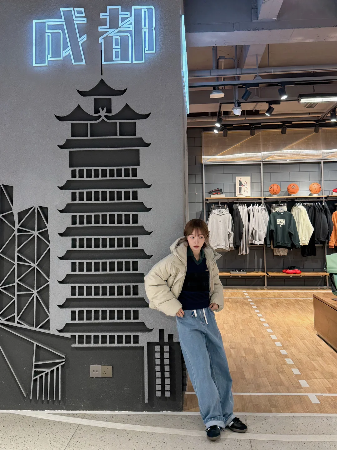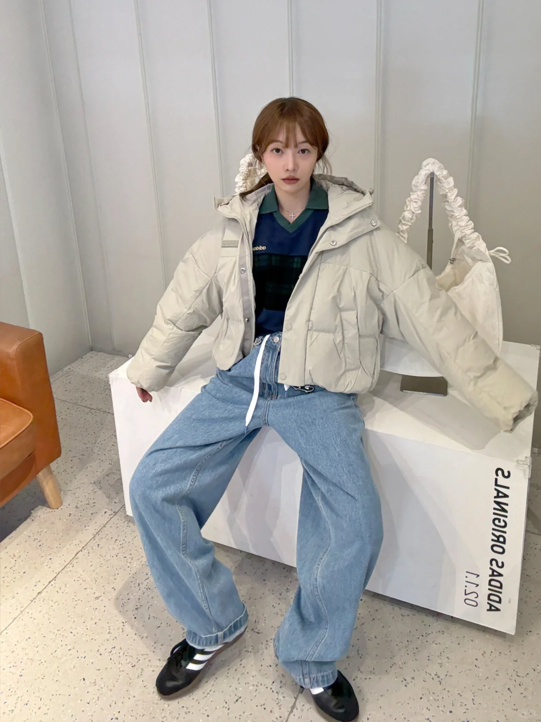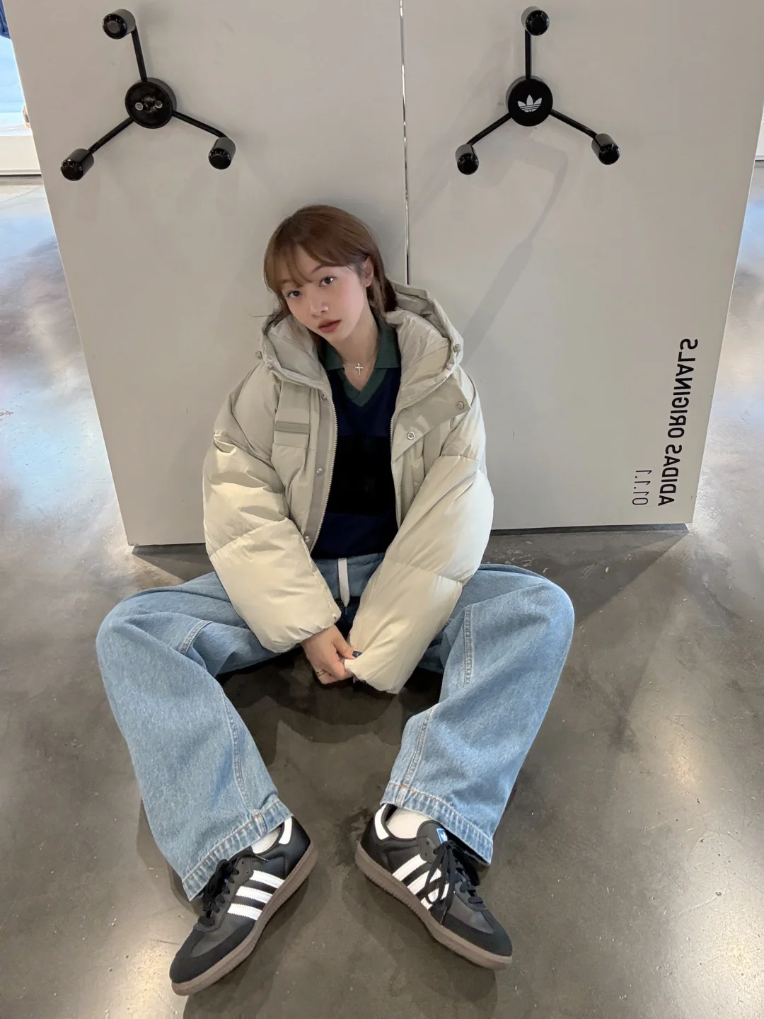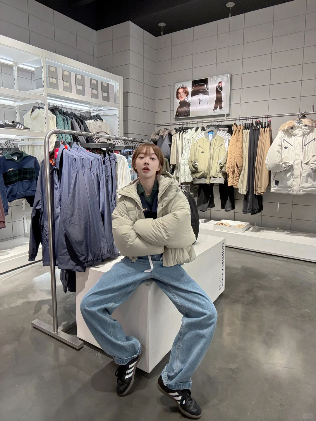 韩系巧棕色羽绒服搭配了一身低饱和的休闲裤及贴肤摇粒绒上衣,