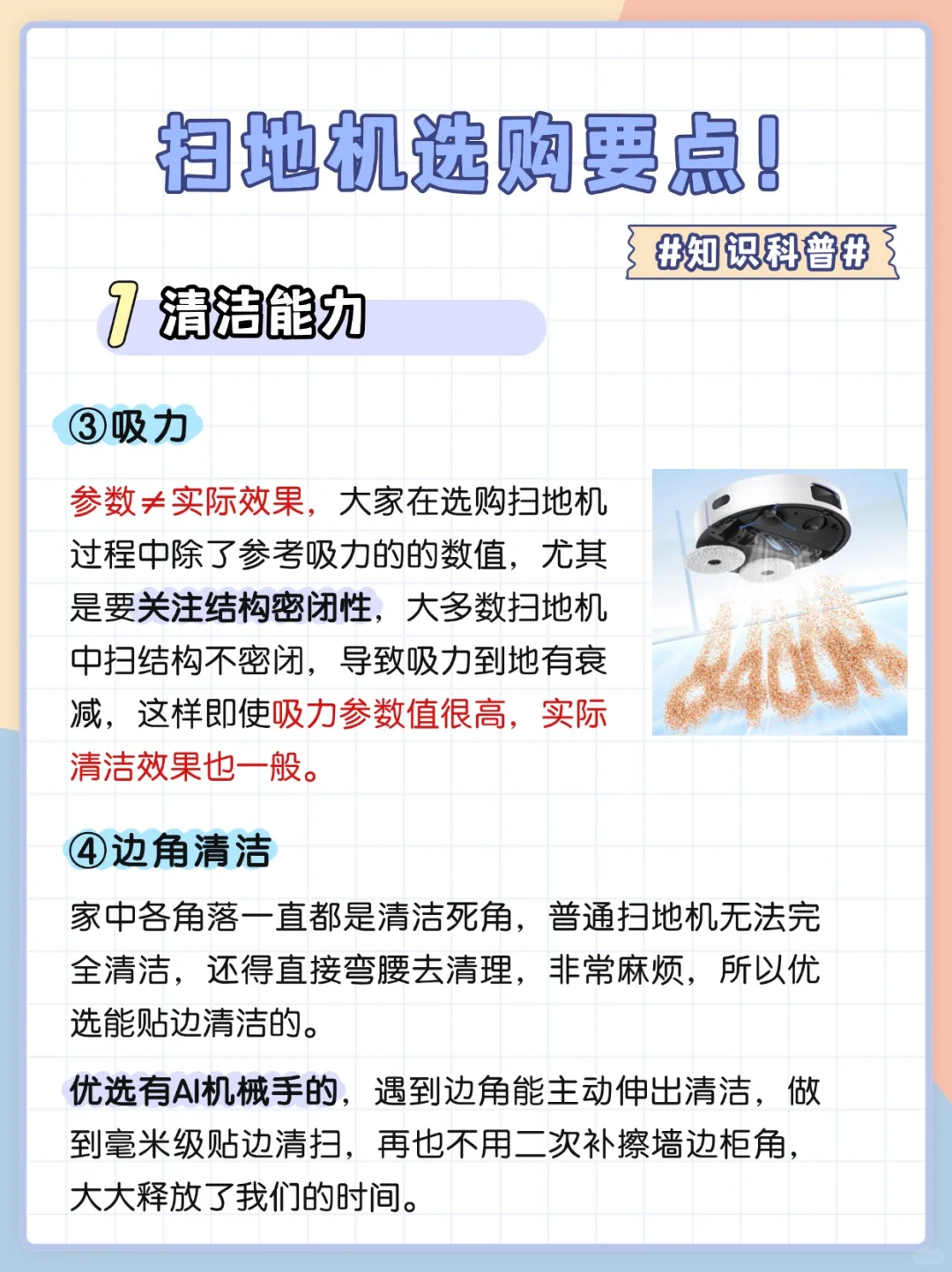 扫地机器人选购加分细节,抓好细节,使用体验更棒。