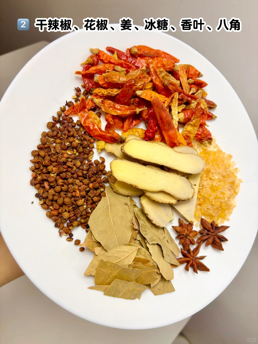 2️⃣又以迅雷不及掩耳之势准备了:干辣椒、花椒、姜、冰糖、香叶、八角