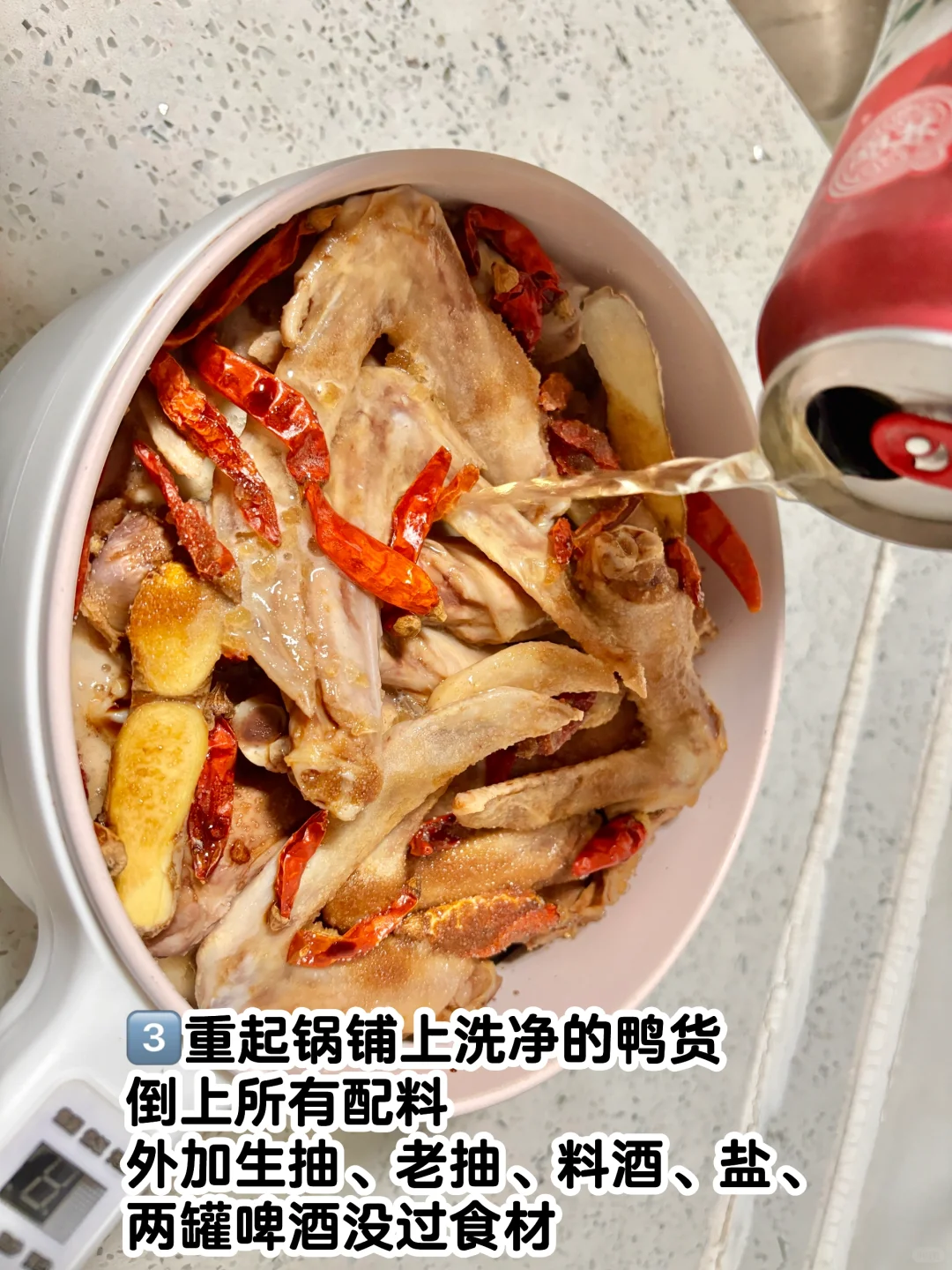 3️⃣一个不注意,又重起锅铺上了洗净的鸭货,倒上所有配料,外加不少生抽、老抽、料酒、盐、两罐啤酒没过食材