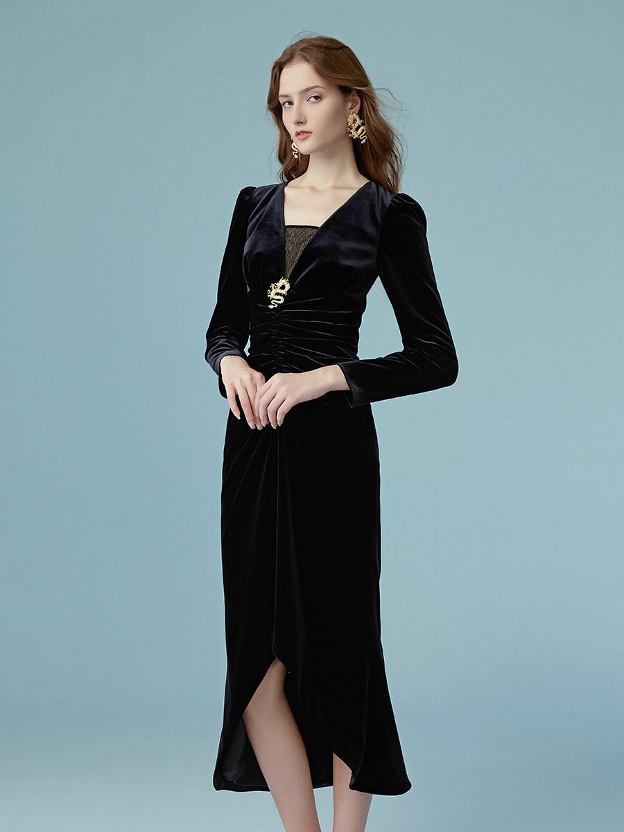 哥文花园秋季新款黑色丝绒鱼尾连衣裙高级感
