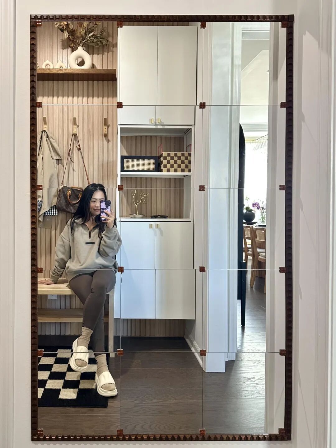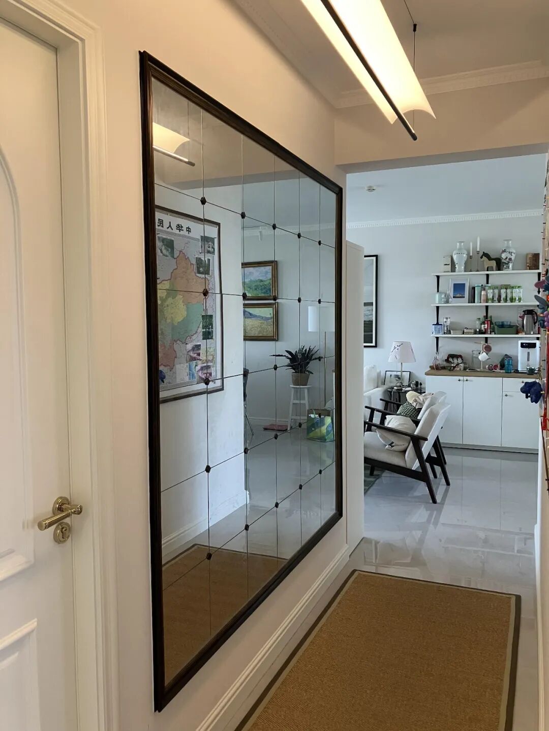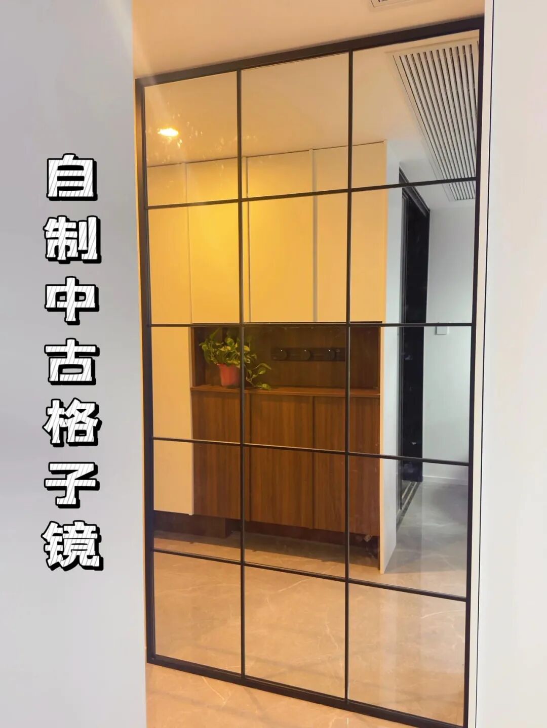 网友@柒柒的小窝 就玩得特别溜,玄关处买了块普通的镜子,花200块钱买了铝合金框架条,往镜子上一贴,瞬间变成了复古感十足的格子镜!
