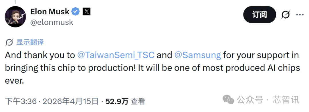马斯克还意外地感谢了@TaiwanSemi_TSC(这里搞错了,应该是台积电)和三星电子,并声称AI5 在某些情况下的性能比前一代AI4提升了40倍。