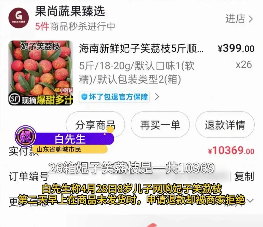 于是,马上联系商家理论,商家却坚称,他当时下单的就是普通的桂花香荔枝,他们一听火冒三丈,要求商家全额退款,可商家根本不答应,直接拒绝他。