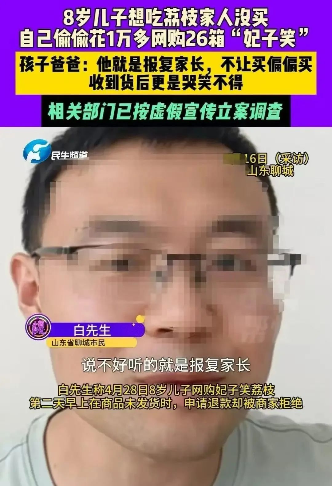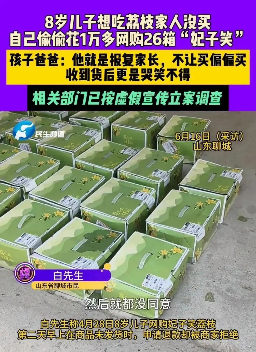 山东聊城一个8岁男孩花1万多网购了26箱荔枝,结果打开却傻眼了,说好的妃子笑成了普通荔枝,这是怎么回事呢?