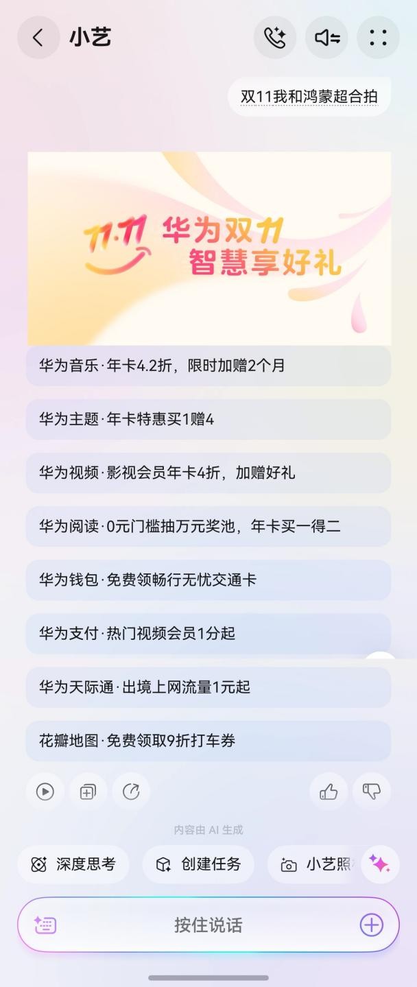 对了,虽然双11已经结束了,但我们还可以唤醒小艺说“双11我和鸿蒙超合拍”,一键领取好礼。快去看看还有哪些华为应用还在活动中吧~