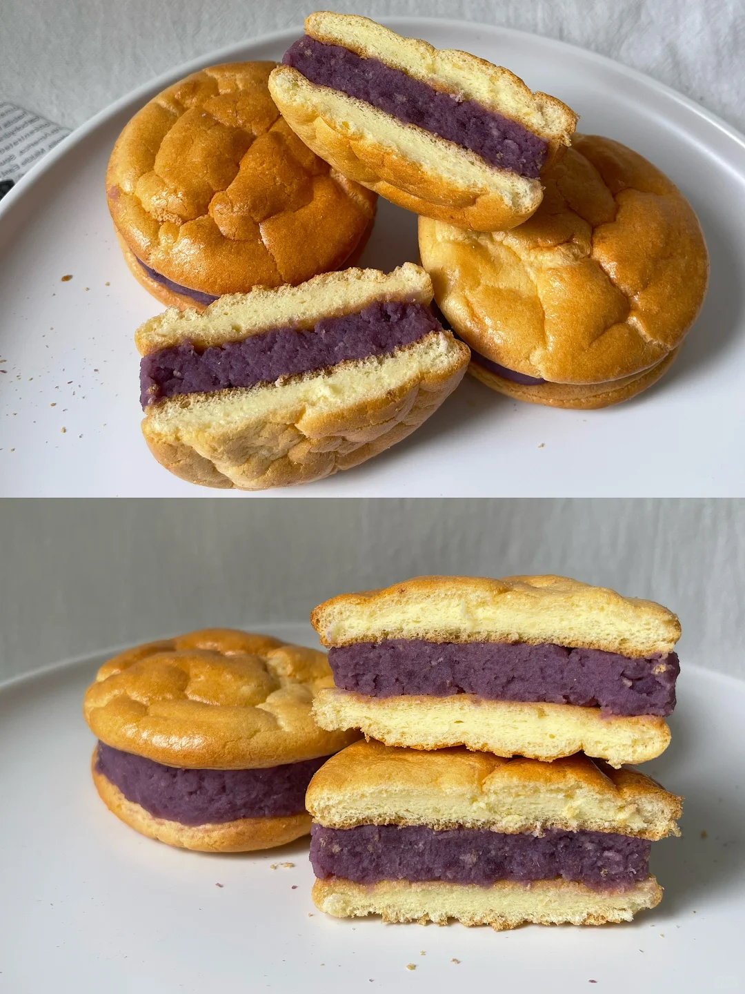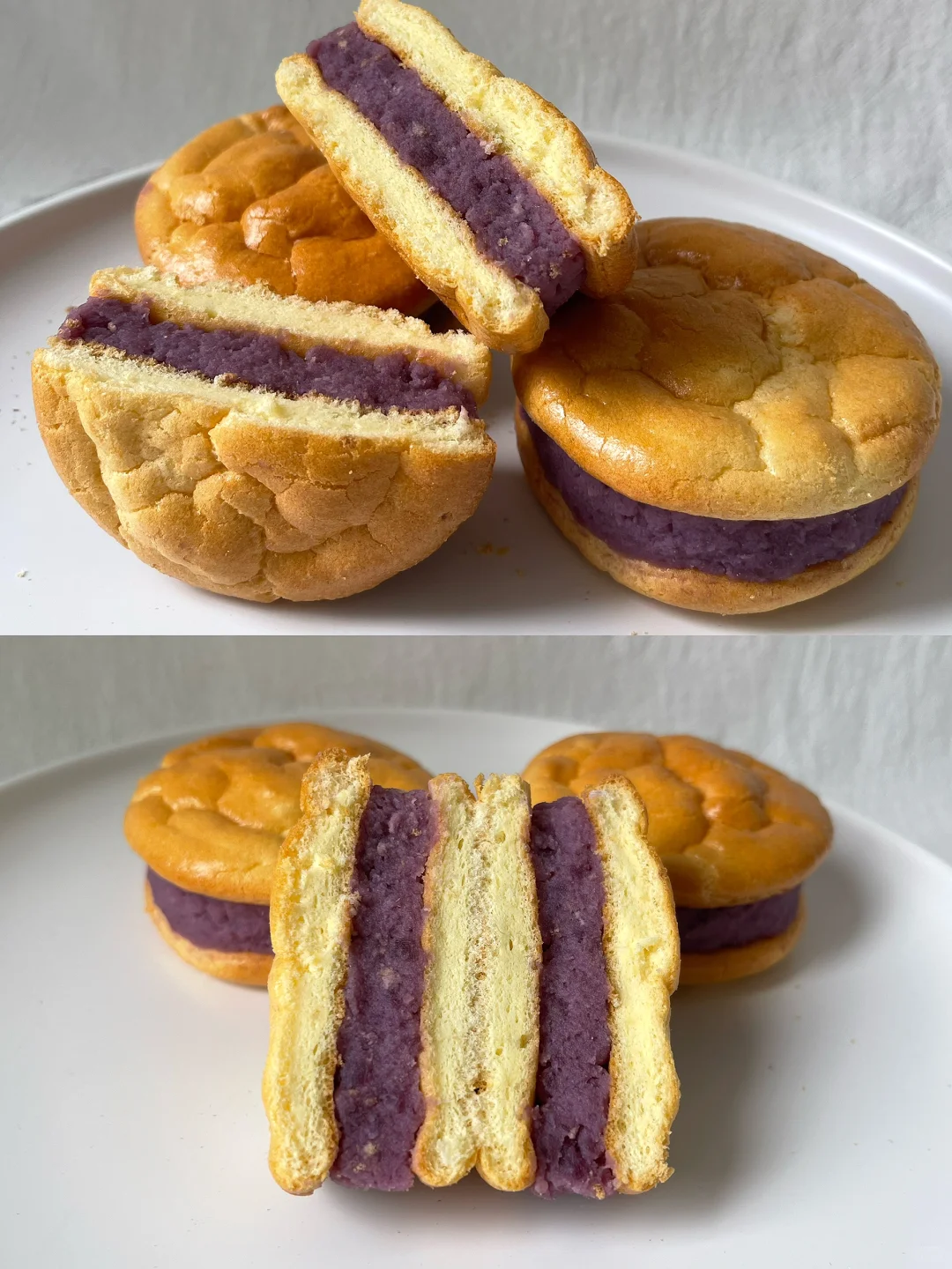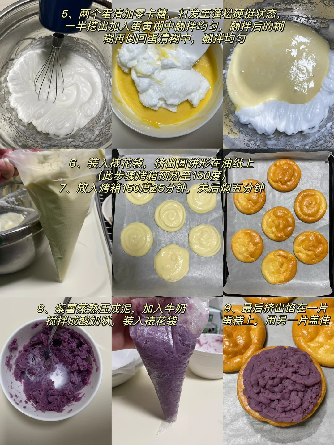 4⃣️紫薯上锅蒸熟压成泥,加入足量牛奶成酸奶状,装入裱花袋,挤出在蛋糕片上做内馅,用另一片蛋糕片盖上
