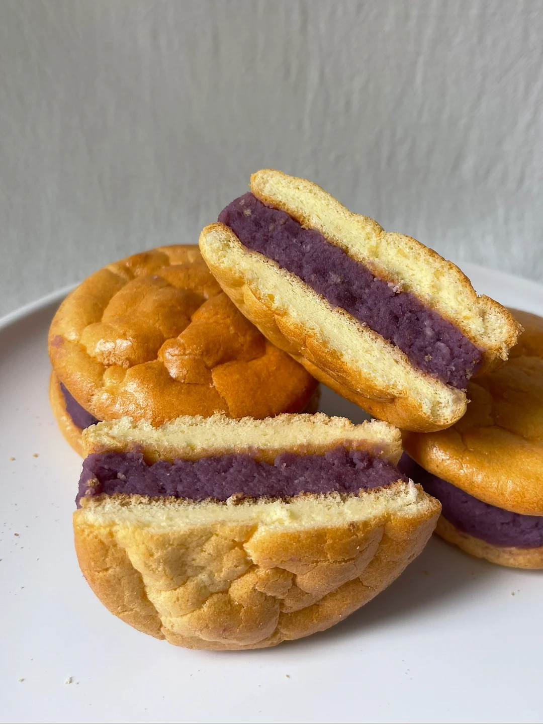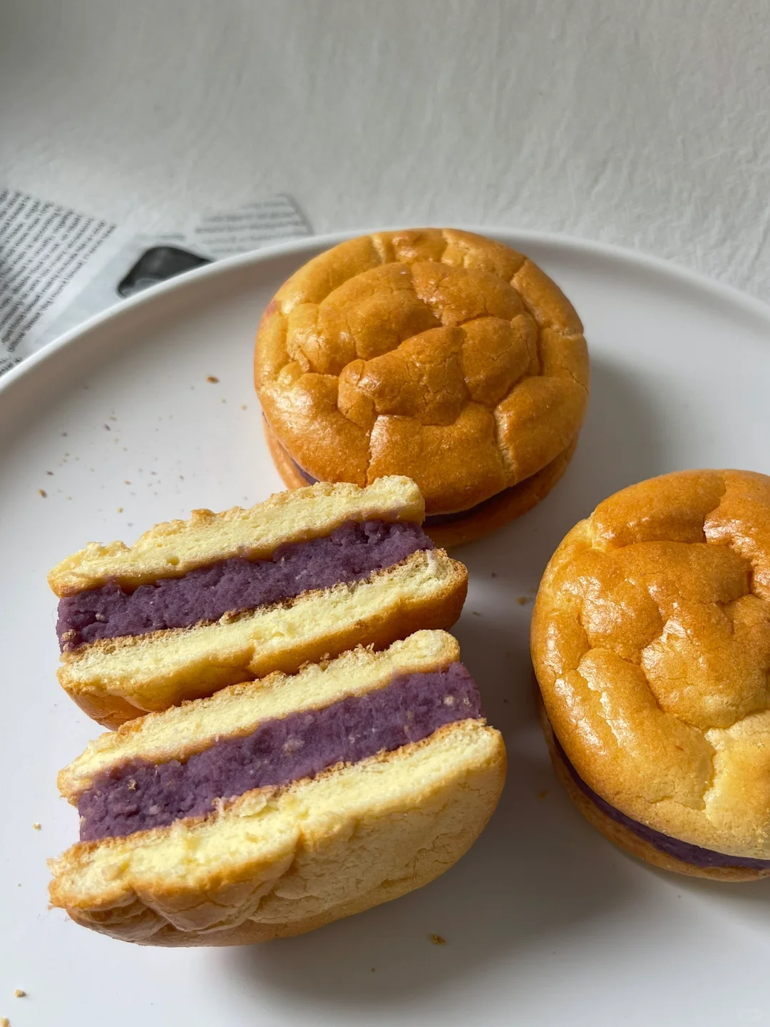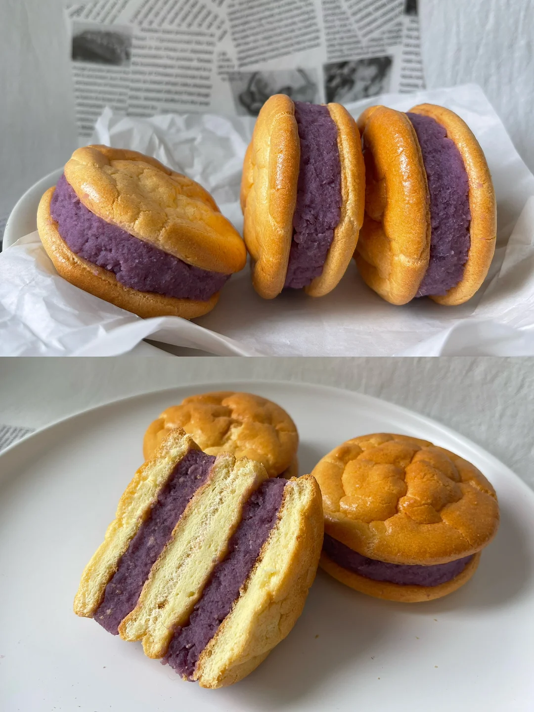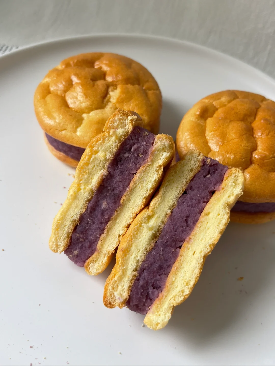 4⃣️紫薯上锅蒸熟压成泥,加入足量牛奶成酸奶状,装入裱花袋,挤出在蛋糕片上做内馅,用另一片蛋糕片盖上