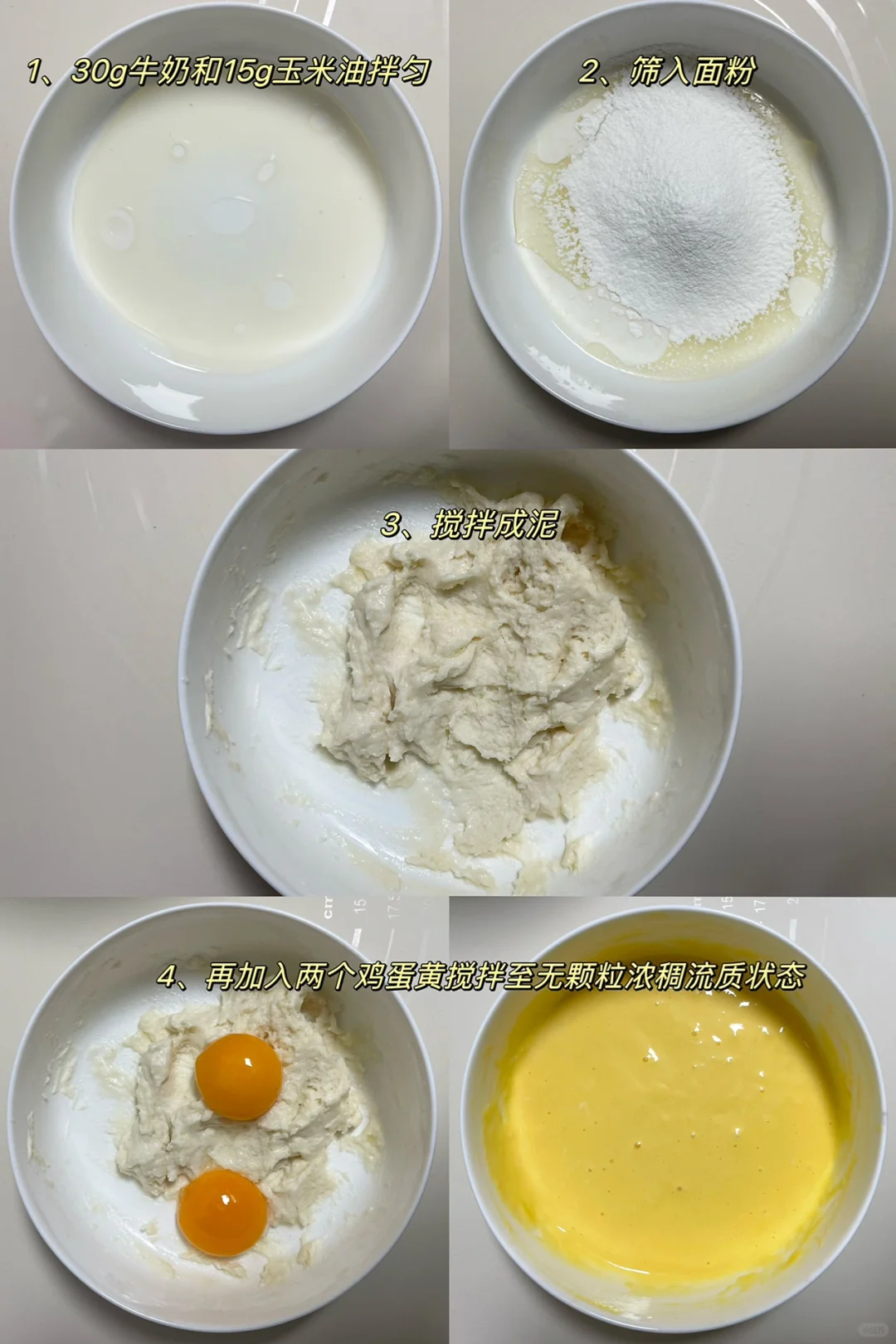 1⃣️30g牛奶和玉米油拌匀,筛入面粉搅拌均匀,再加入两个鸡蛋黄搅拌至无颗粒浓稠流质状态