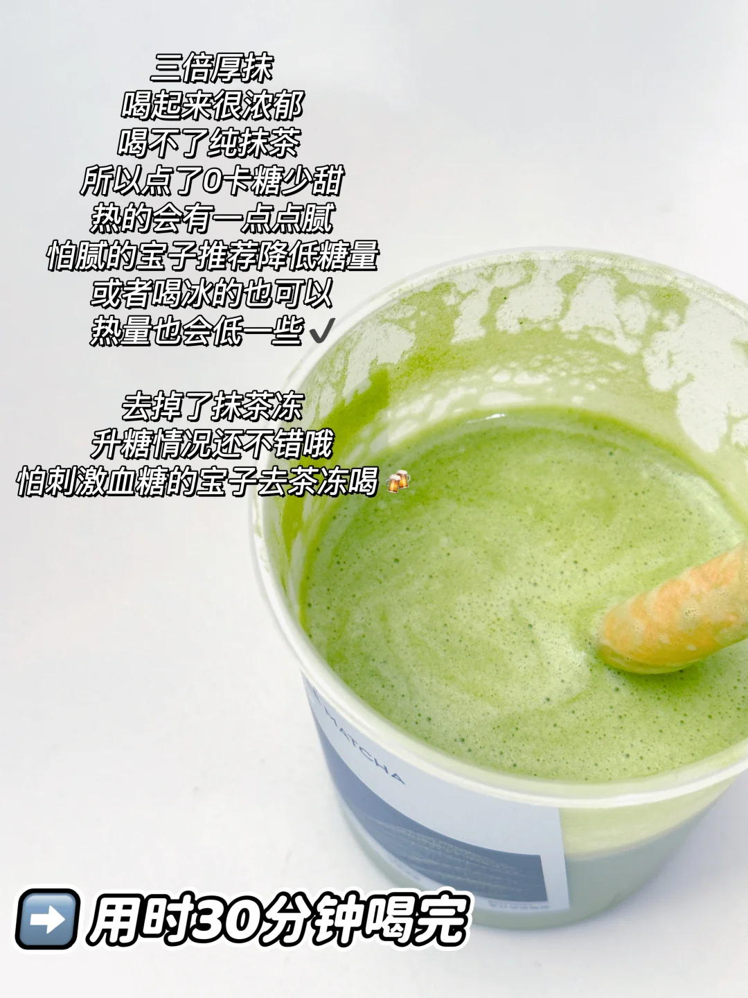 三倍厚抹喝起来很浓郁,喝不了纯抹茶 ,所以点了0卡糖少甜〰️