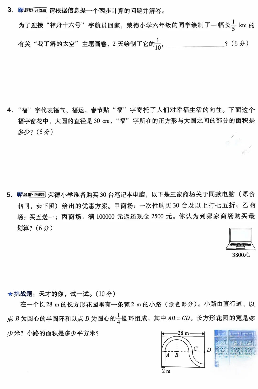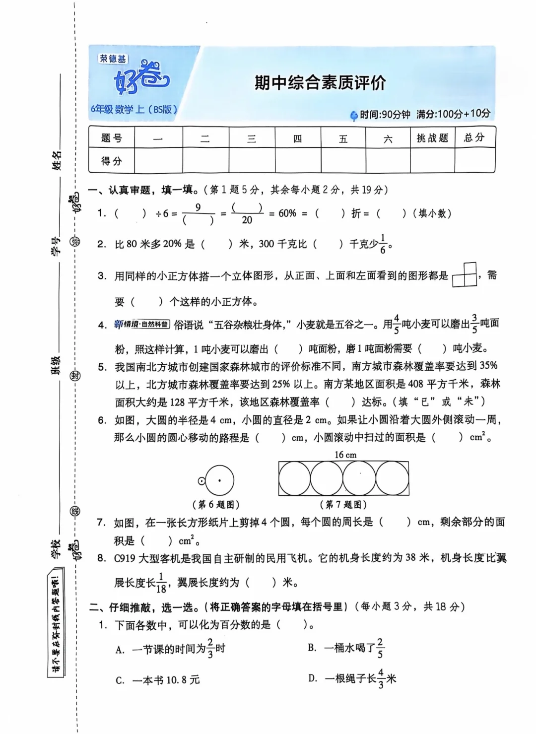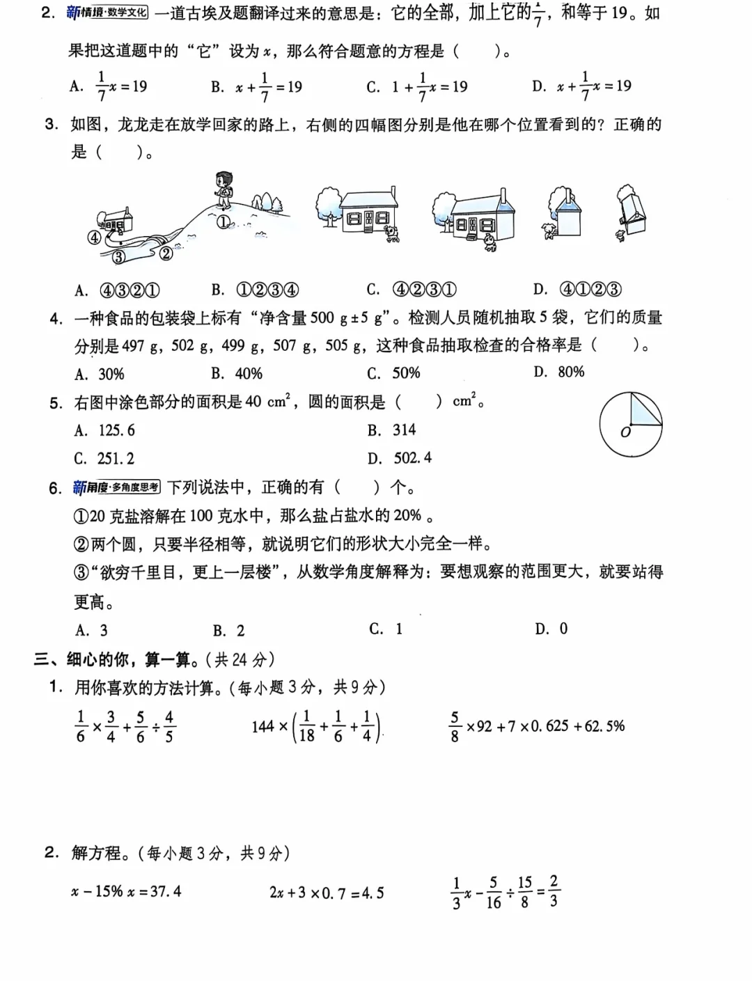 圆、分数混合运算、观察物体以及百分数知识点的综合考察