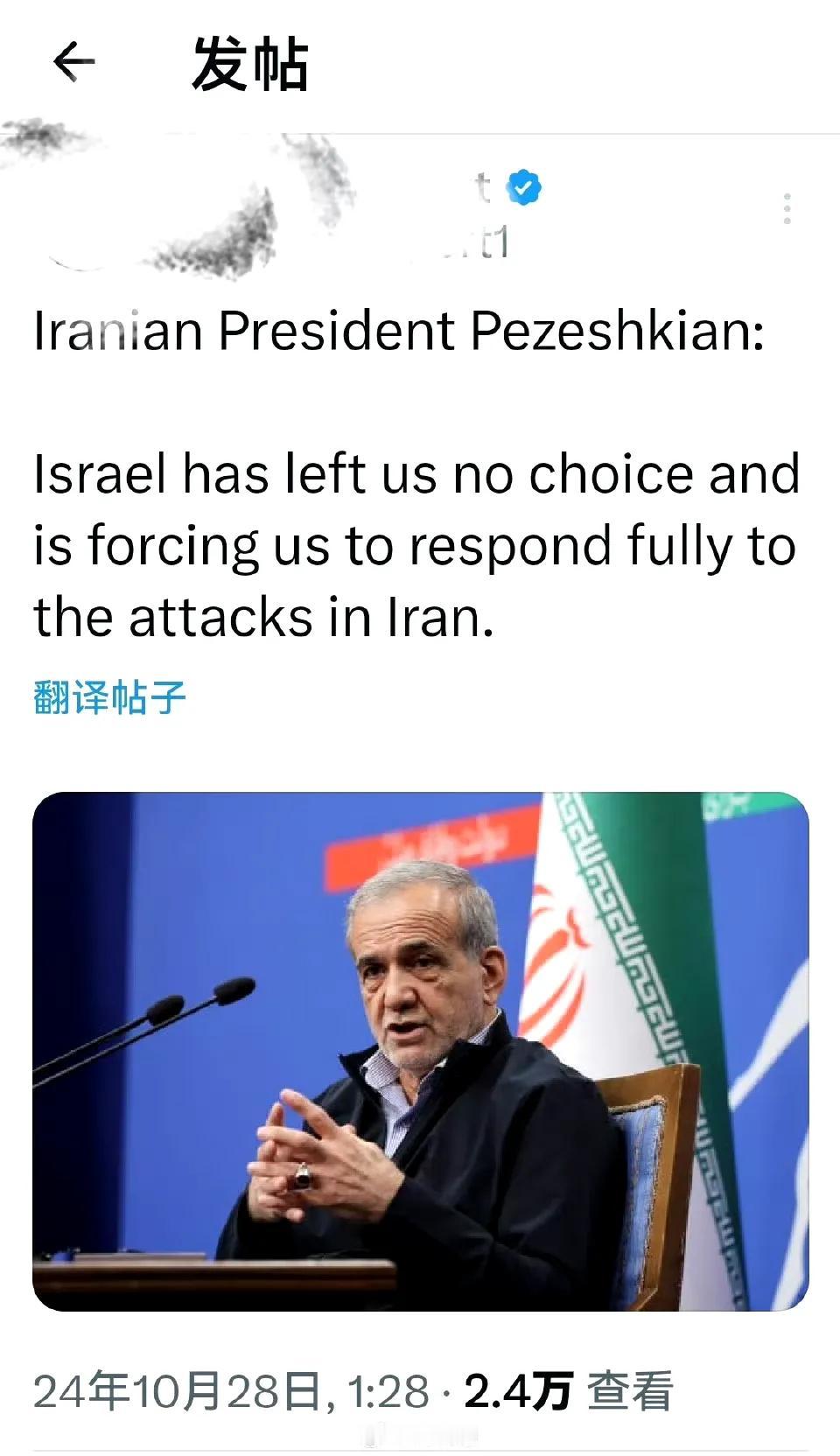 #以色列称袭击前未告知伊朗# #伊朗总统称将对以色列侵略作出反应# 不可思议!以色列对伊朗的袭击结束之后,不仅以色列警告伊朗不要再做出反击、试图升级冲突,而且美国也大言不惭地认为伊朗应该不了了之,并且声称本轮以伊冲突应该就此结束。然而,以色列的此次行动不仅出动了多达100架以上的战斗机,而且被曝还对伊朗的导弹基地、无人机工厂和多个军事设施进行了针对性的打击,虽然或给伊朗造成的损失有限,但显然美国看到以色列占了便宜之后,明显想让伊朗息事宁人、做出让步。