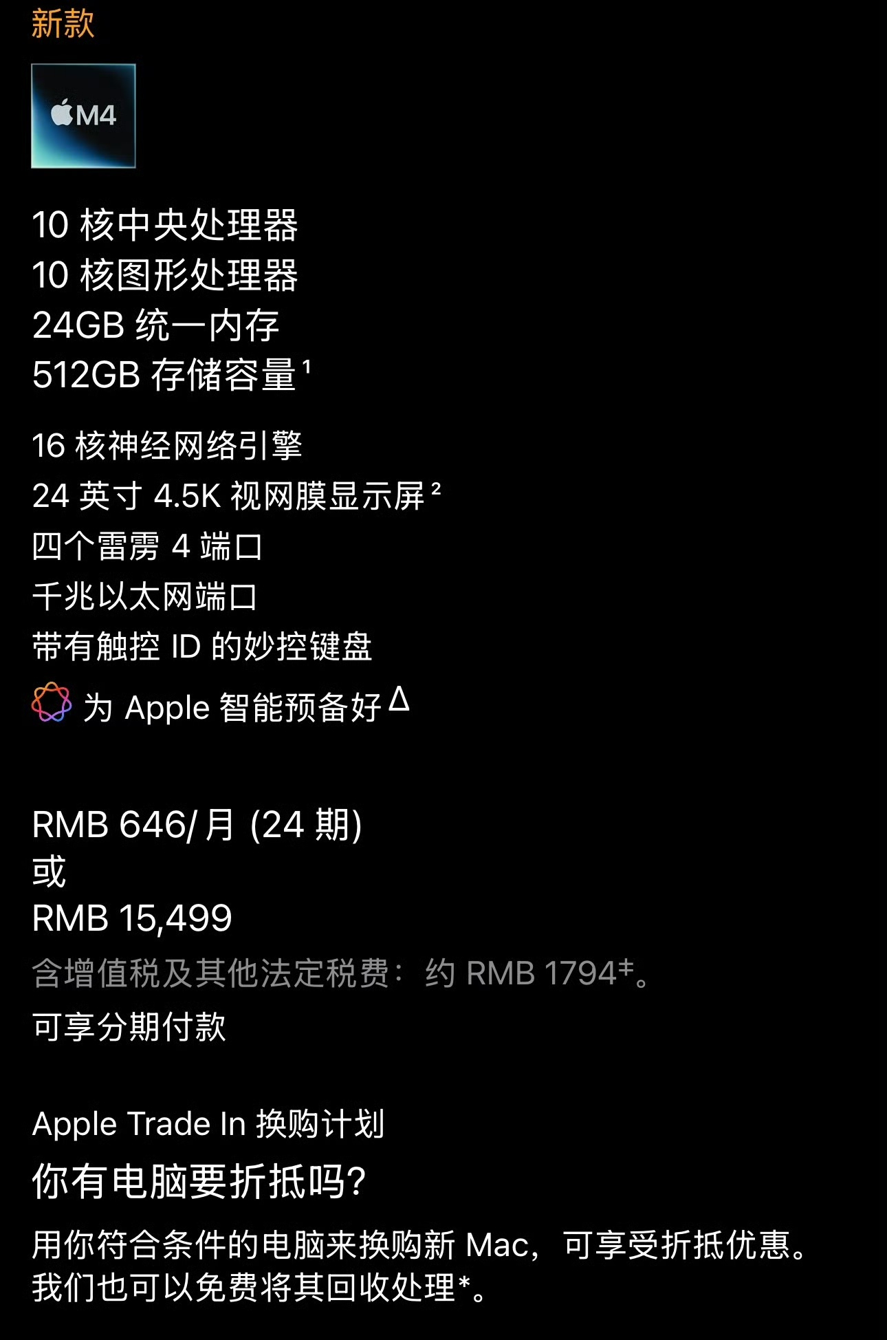 iMac 2024 将提供四款配置机型,全系标配 M4 处理器,运行内存16GB起