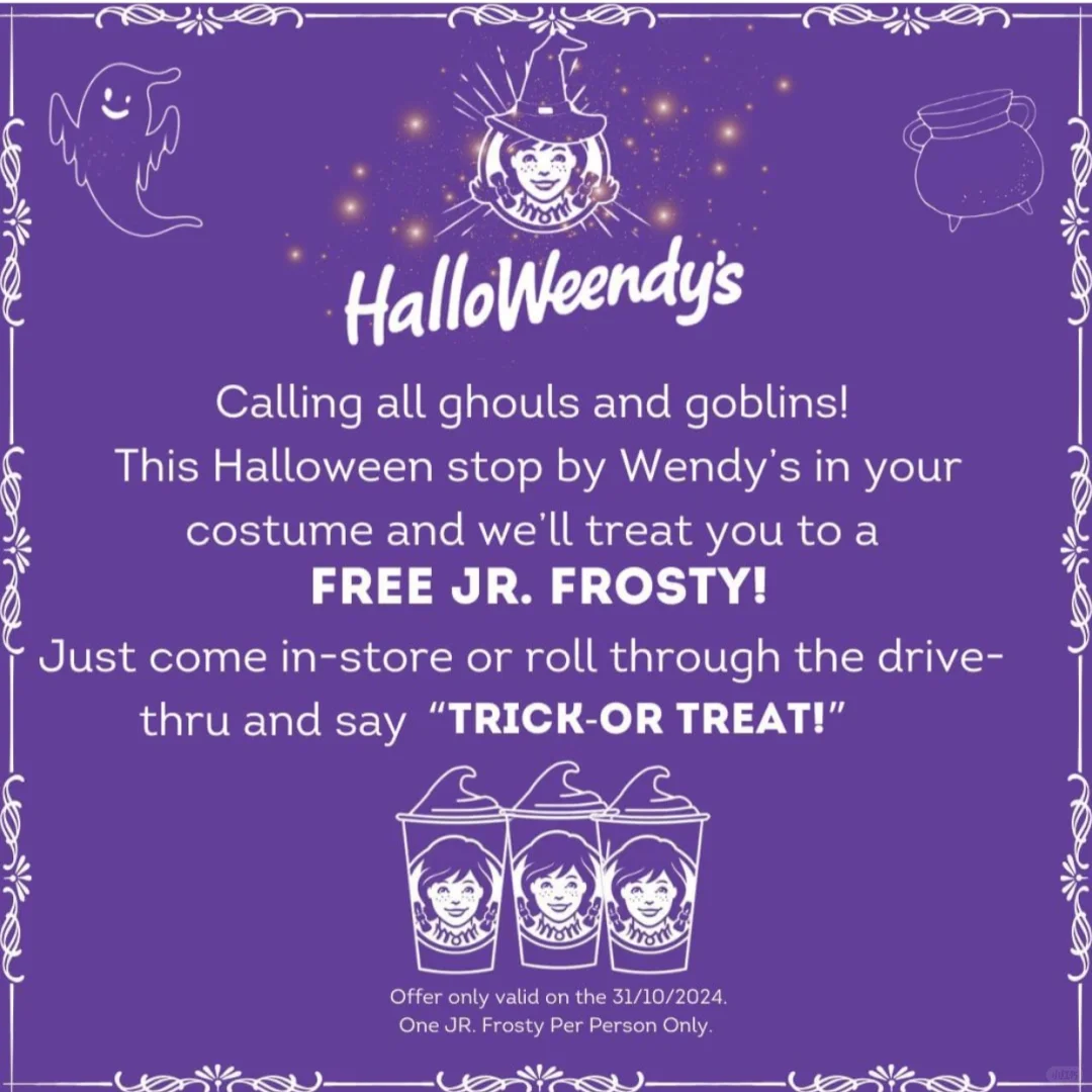 Wendy's万圣节活动来袭~!10.31号当天,穿上你的万圣节服装,向Wendy's工作人员说“Trick or Treat.”,你就会得到店里赠送的一份JR. Frosty 霜冻奶昔一份[色色R][色色R]小朋友最爱,赶紧去吧[派对R] 关注我,下一篇更精彩