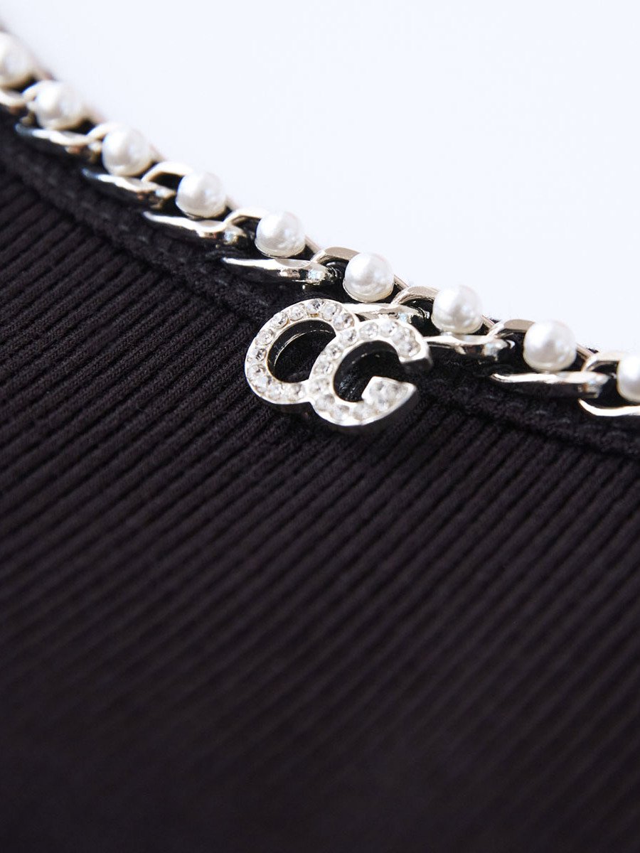 领部链条logo装饰,省去配饰搭配烦恼,设计独特,增添一丝精致;粘胶针织面料,紧密竖状纹理,手感柔软穿起轻便,柔韧性好;黑白两色针织侧边系带松紧设计,打造多种穿搭风格,增加装饰性且包容性好。