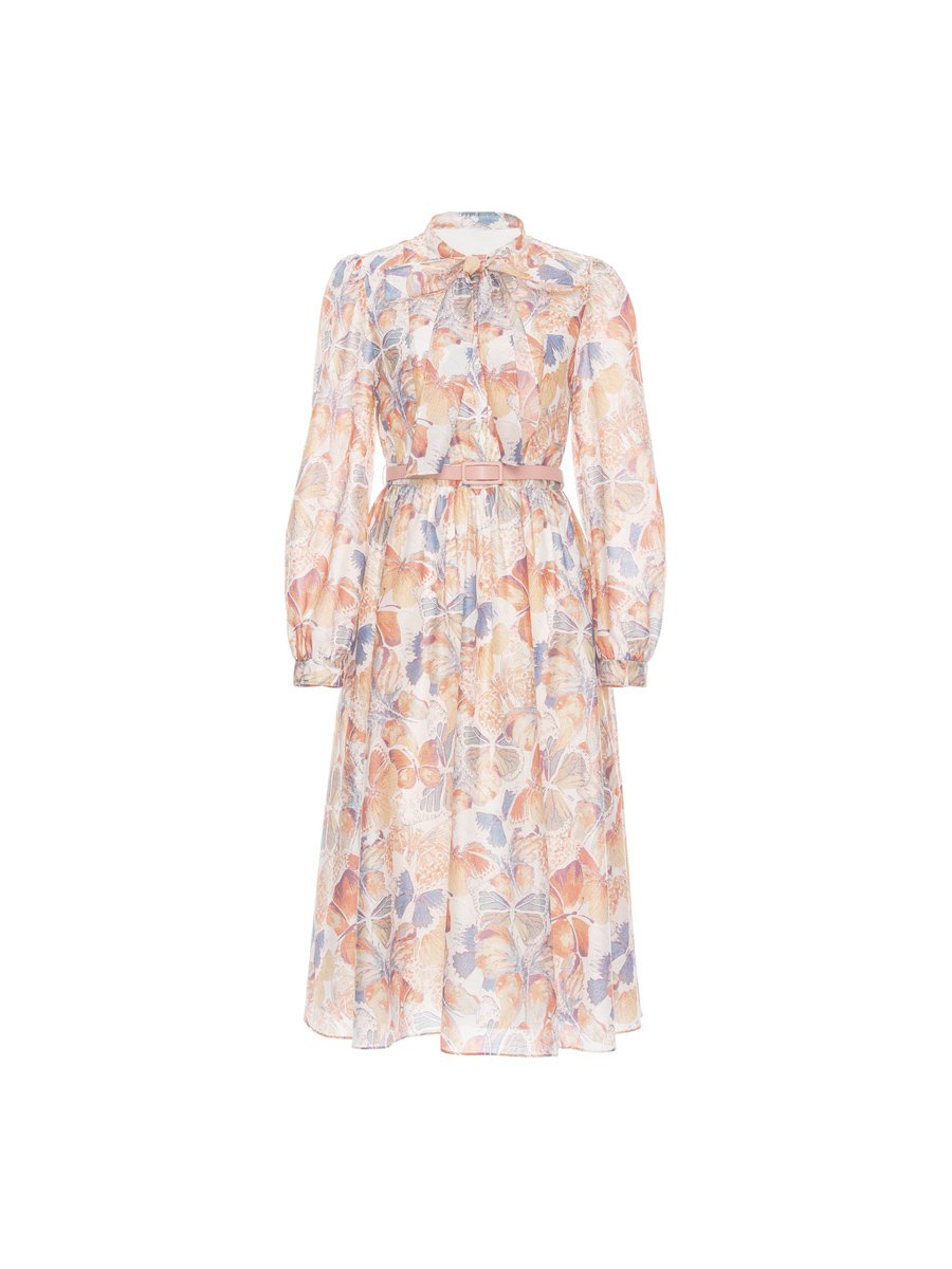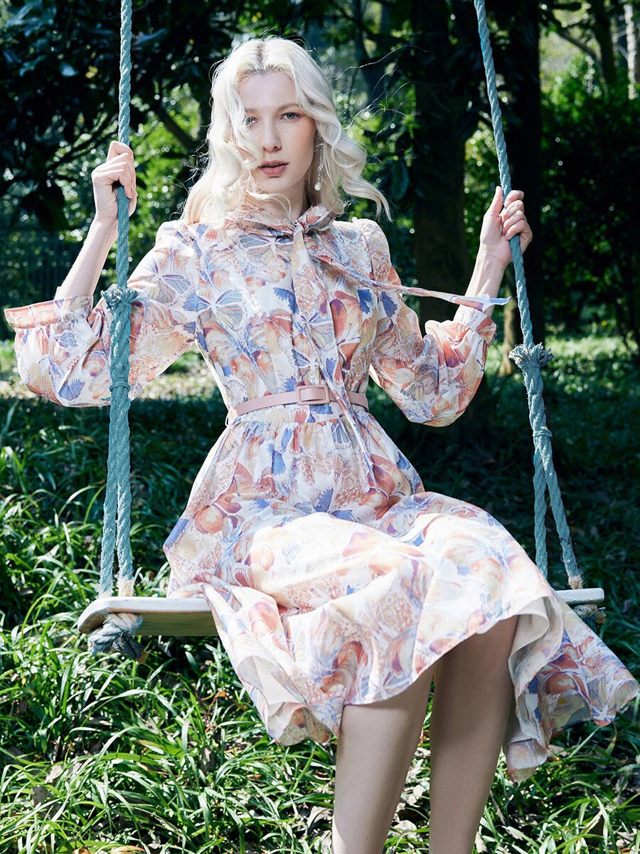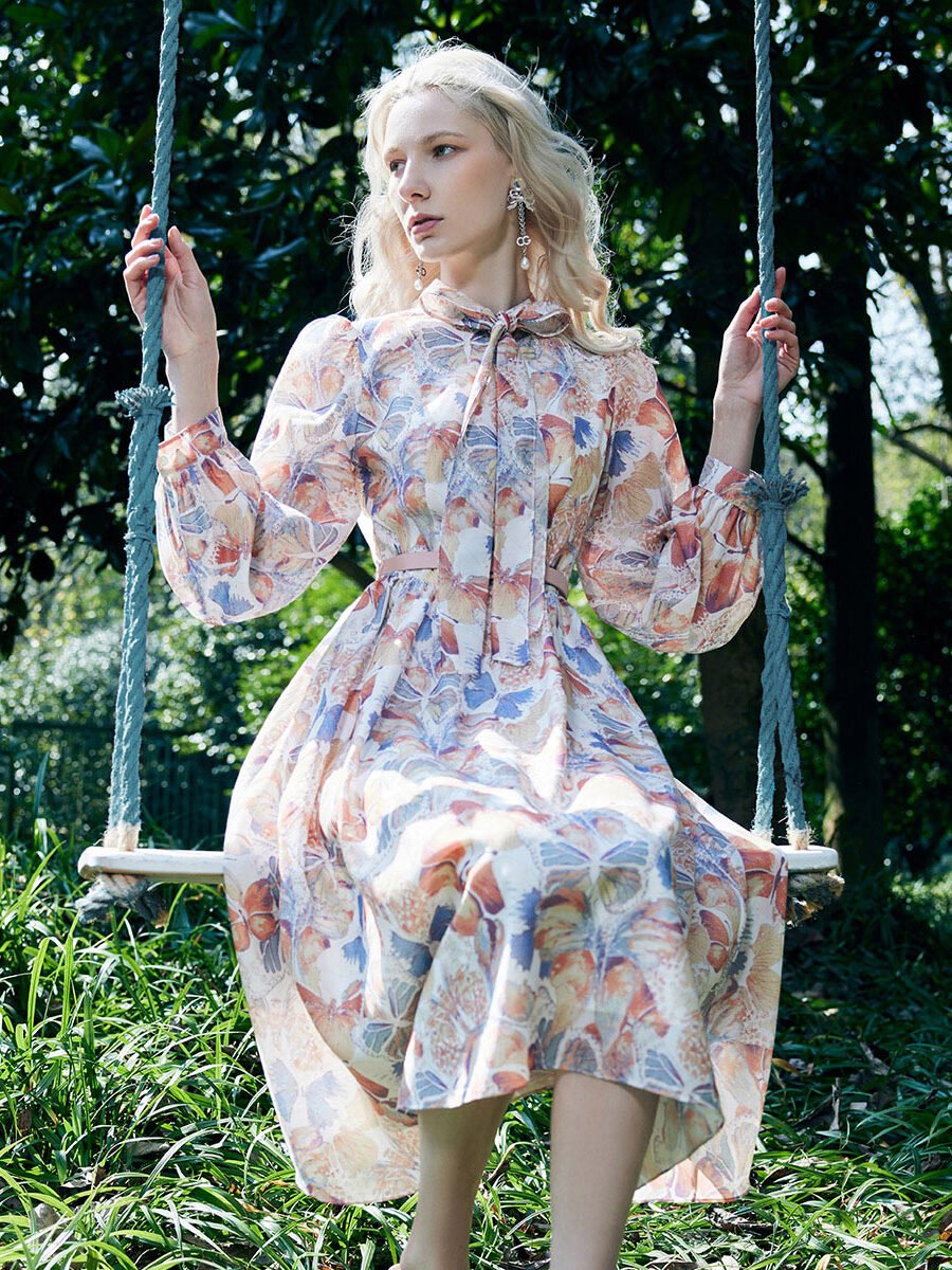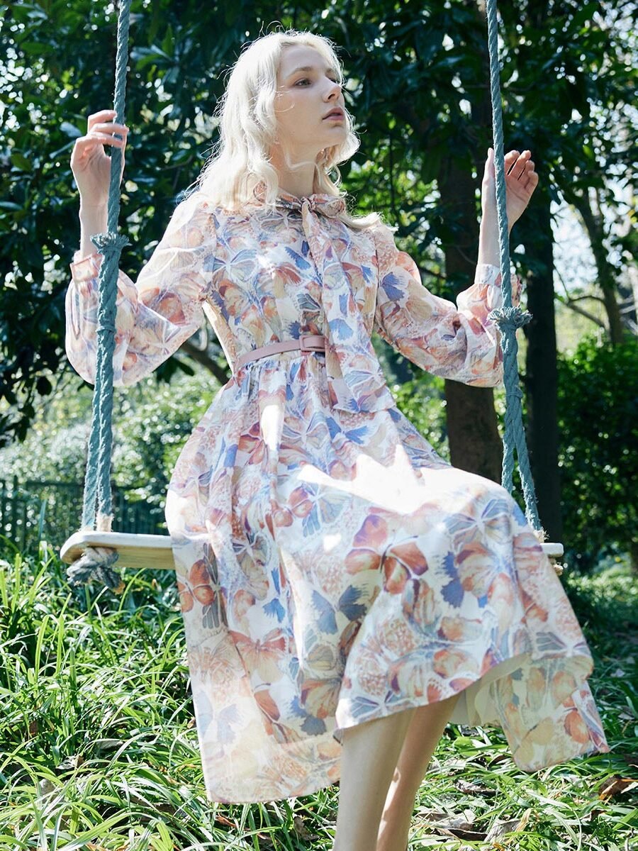 配有腰带自由调节性高,收腰修身,让女性姣好身材尽显优雅魅力;涤纶面料柔软抗皱的品质较好,亮丽有光泽,手感柔软舒适;梦幻蝴蝶花栩栩如生,浪漫艺术;经典贵族裙型端庄典雅。
