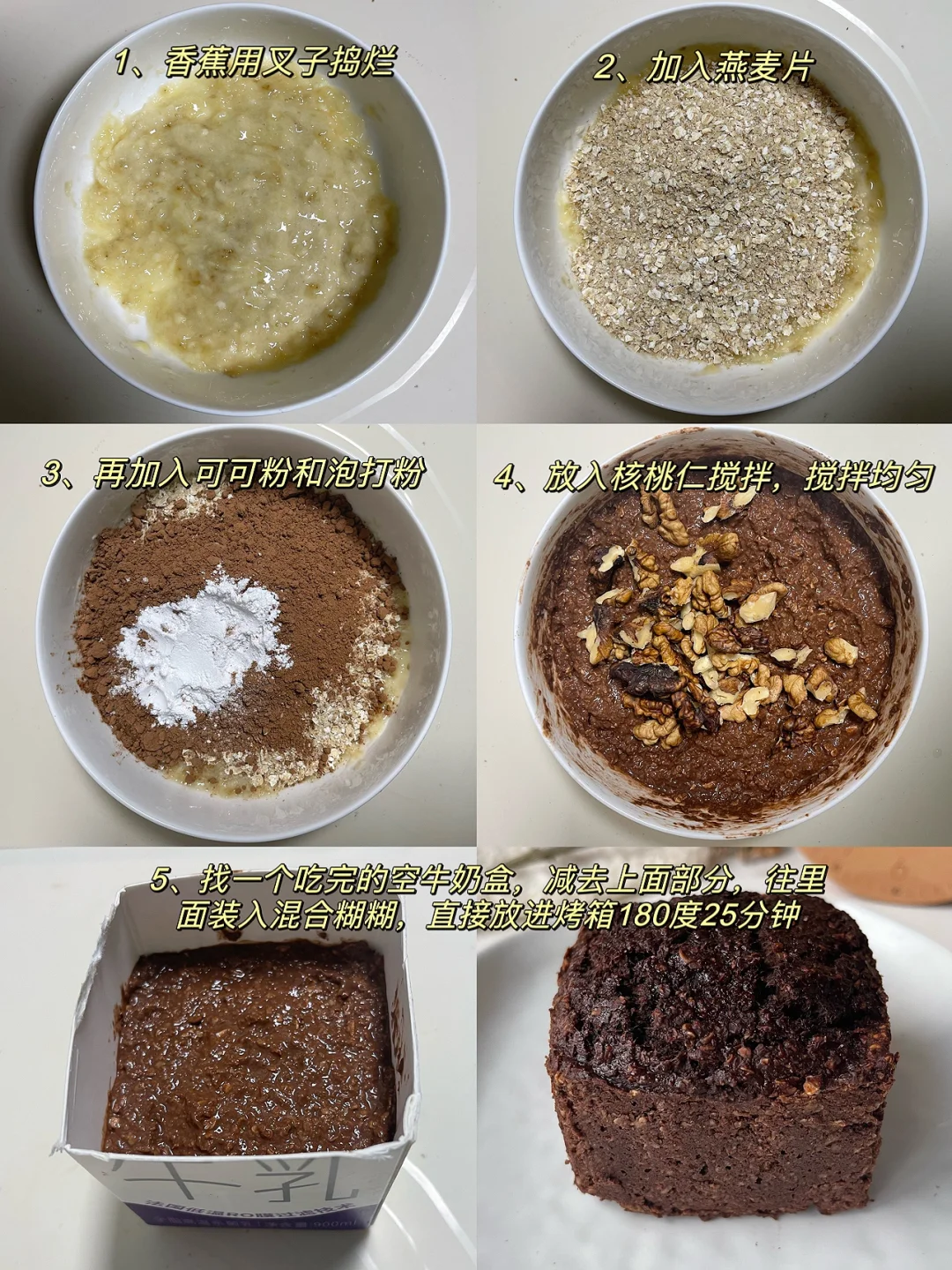 1⃣️香蕉用叉子捣成泥,加入燕麦片、可可粉和泡打粉搅拌均匀,再加入适量大核桃仁搅一搅