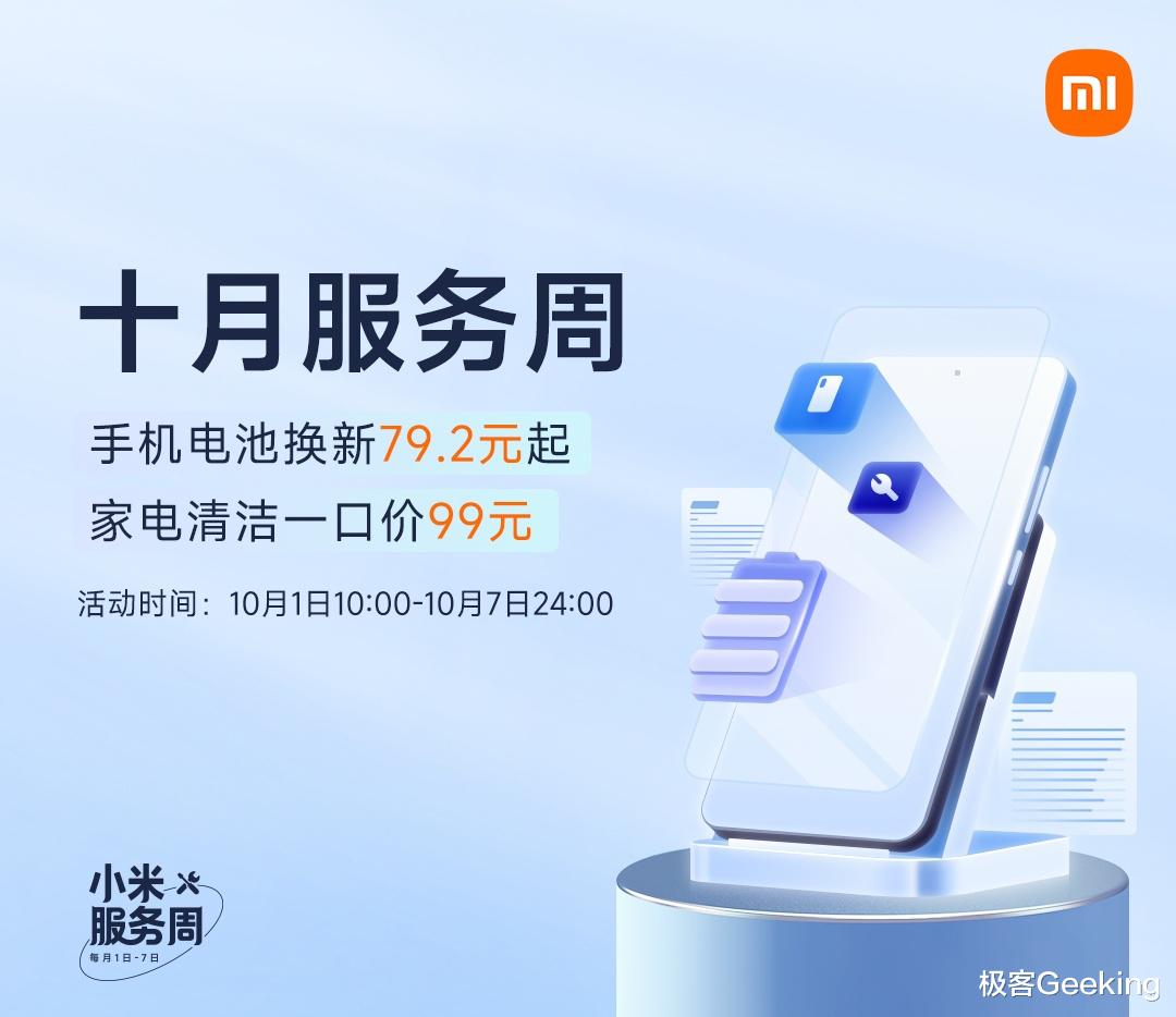 小米现已开启新一轮的售后服务活动,也就是官方称的“10 月服务周”,服务内容包括 8 折手机电池换新和笔记本电脑 5 折深度清洁保养,以及大家电的清洁保养等服务内容,活动期限是 10 月 1 日到 7 日,同样是为期一周的时间,有相关需要的读者可以特别留意一下。