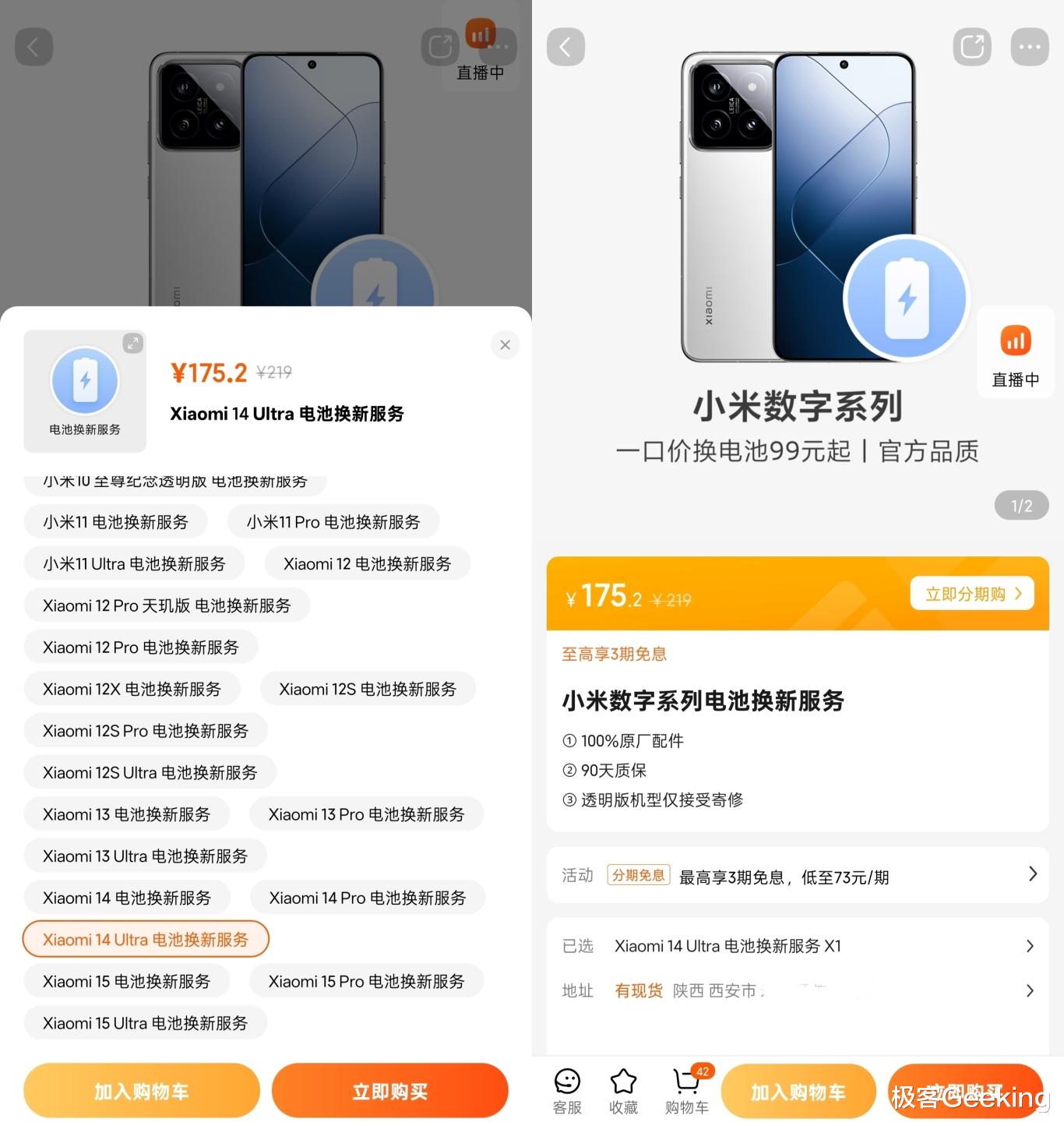 比如其中的小米14 Ultra,这款手机上市于 2024 年 2 月,换块电池的原价是 219 元,8 折活动价则是 175.2 元,同时有小米11 Pro/Ultra 的价格也是如此。