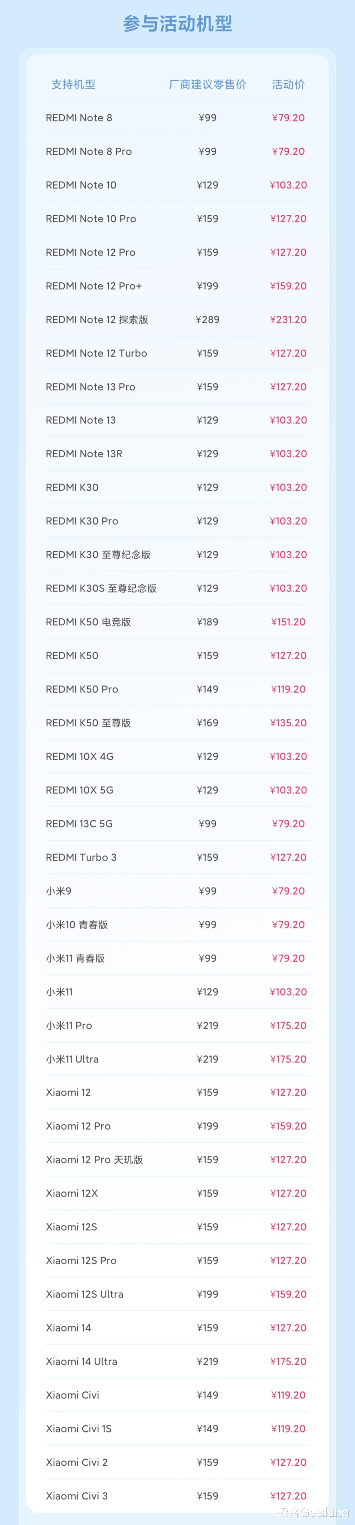 这也被最多用户所关心的服务项目,此次手机电池 8 折换新的活动价格是 79.2 元起,共支持多达 42 款机型,较上一次新增了 10 款,主要包括小米11/12/12S 系列、小米 Civi 系列,以及红米K50/K30 系列和红米Note 13/12 系列等手机,完整的支持机型名单和对应服务的价格明细如下图: